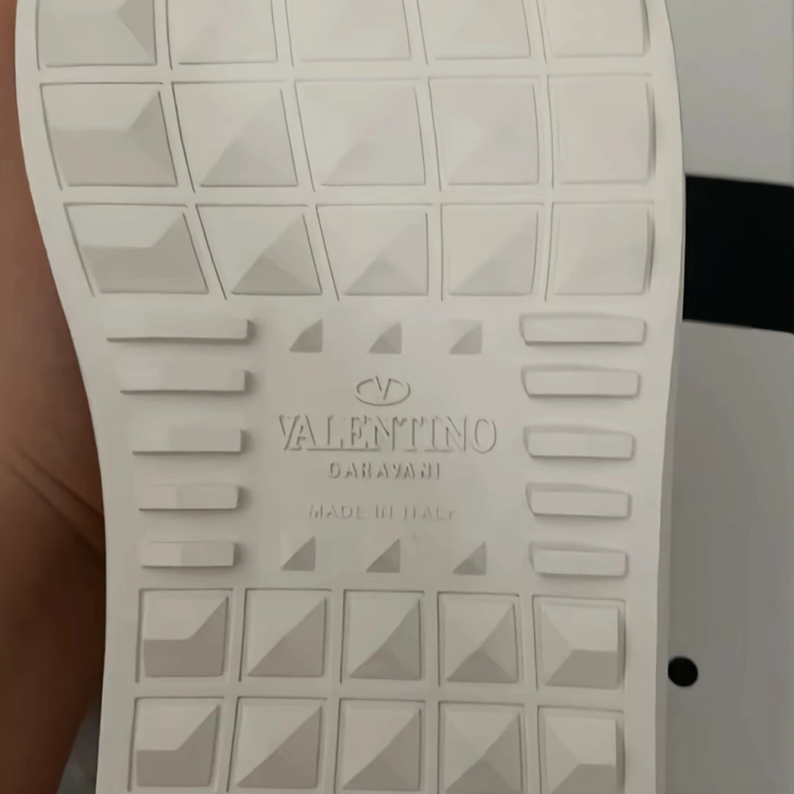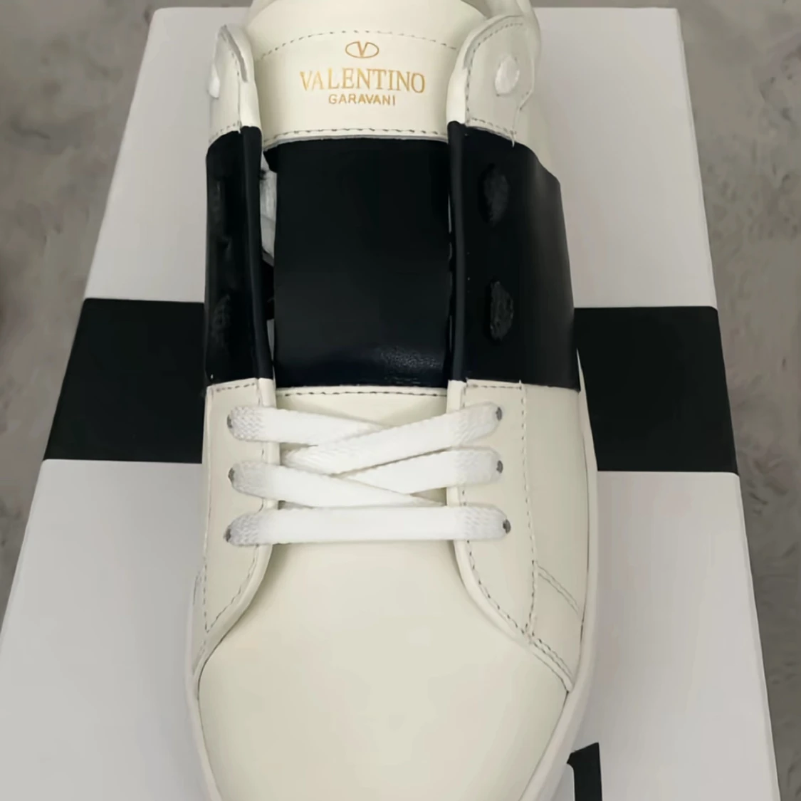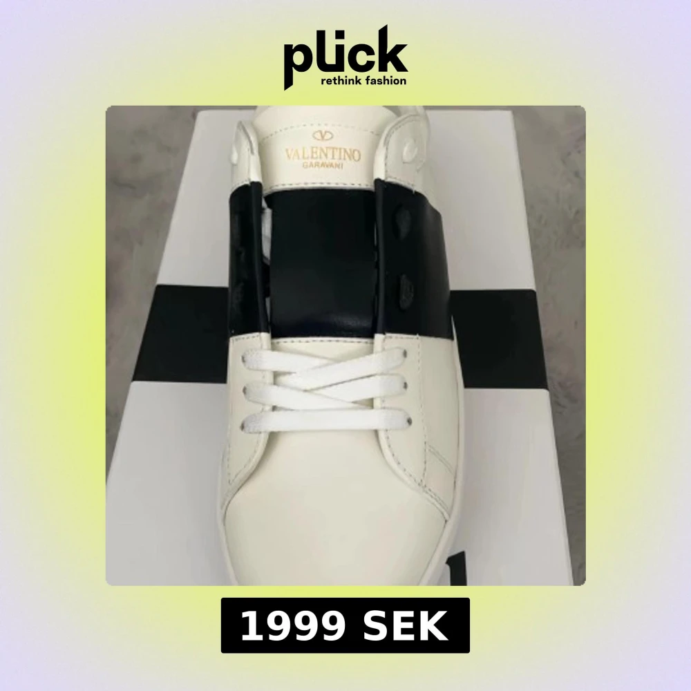 Säljer ett par Valentino Garavani Open sneakers i vitt skinn med bred svart läderdetalj över mitten. Klassisk rund tå, vita snören och chunky vit sula med mönstrad undersida. Snygg och stilren design, perfekt för dig som gillar lyxiga streetwear-vibbar.