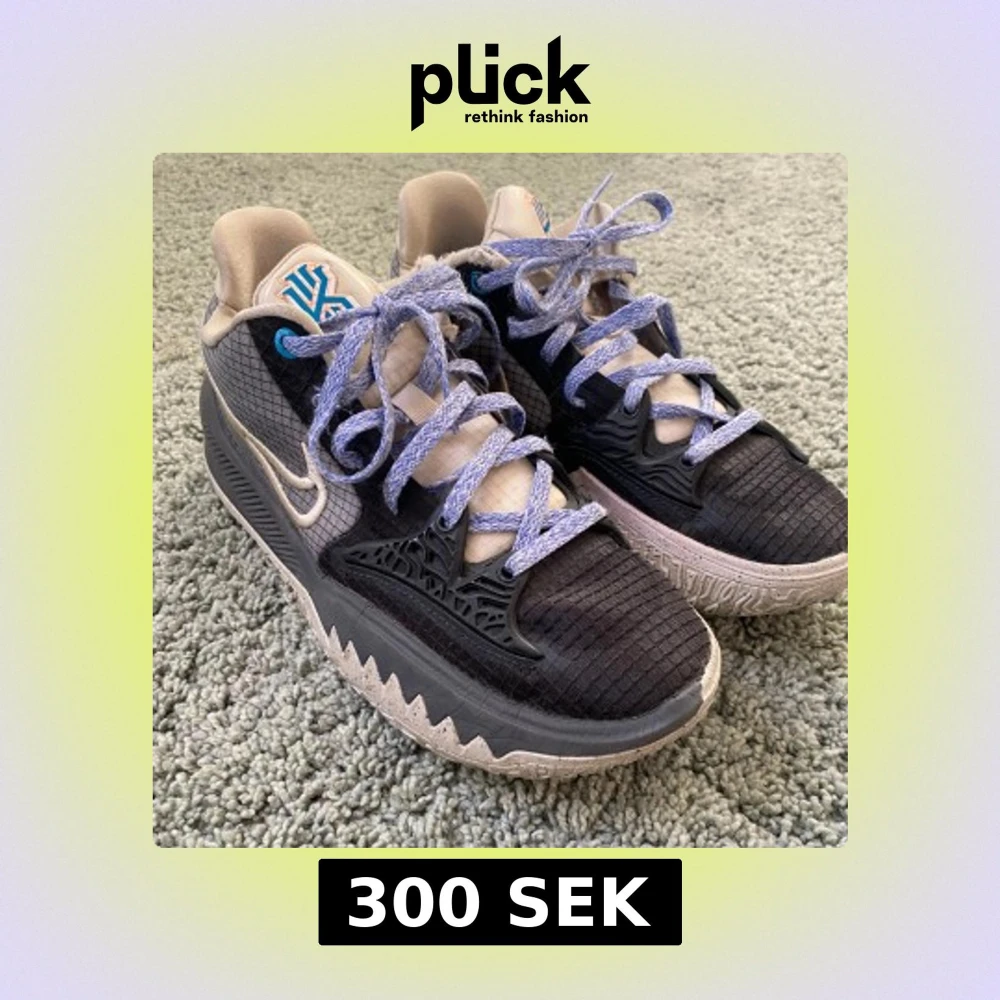 Snygga svarta kyrie sneakers med blå och beige detaljer. Skorna har en unik sula med mönster och snörning i blått. Perfekta för basket. Sulan och insidan är nästan perfekt skick. Bara någon defekt som ni kan se.