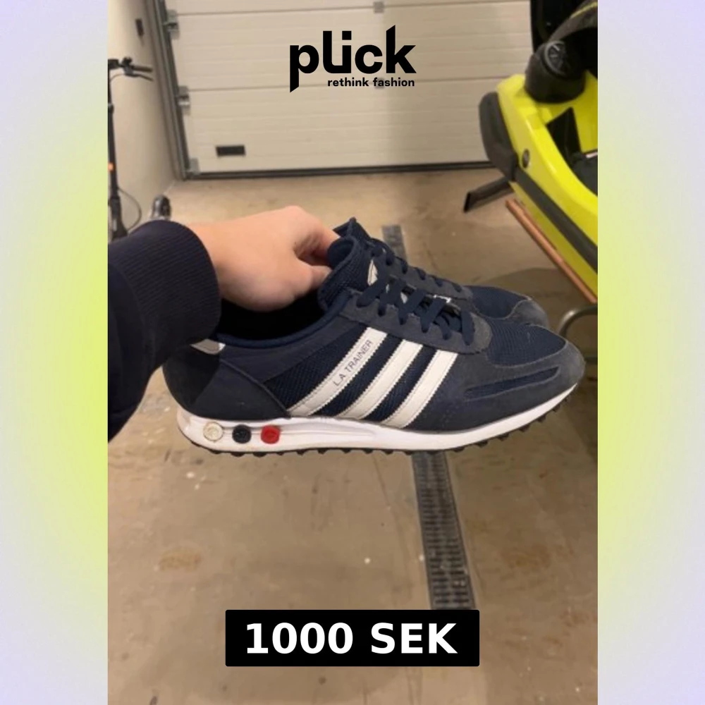 Säljer ett par Adidas LA Trainer sneakers i marinblått med vita detaljer och klassiska tre ränder på sidorna som inte går att få tag på nya. Skorna har snörning, platt sula och ovandel i mocka och mesh för en sportig look. Ikoniska pluggar i sulan och Adidas-logga på hälen.