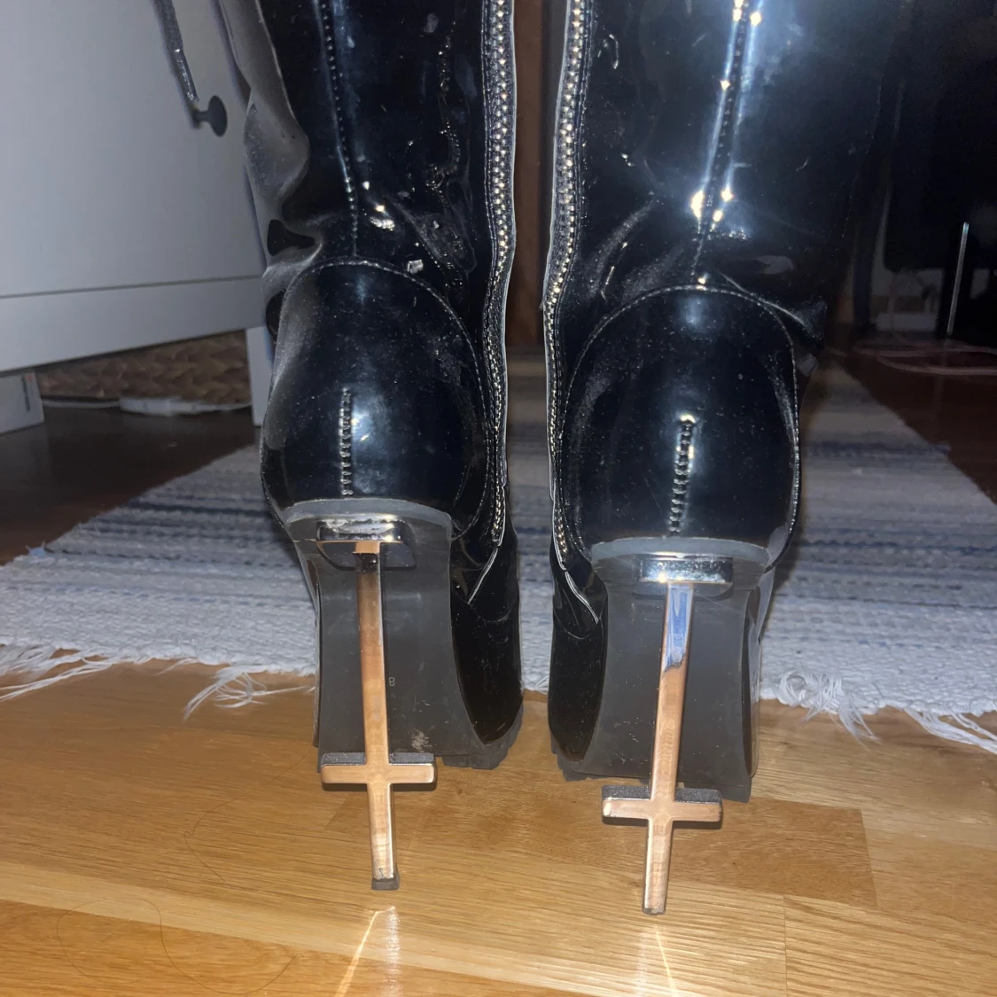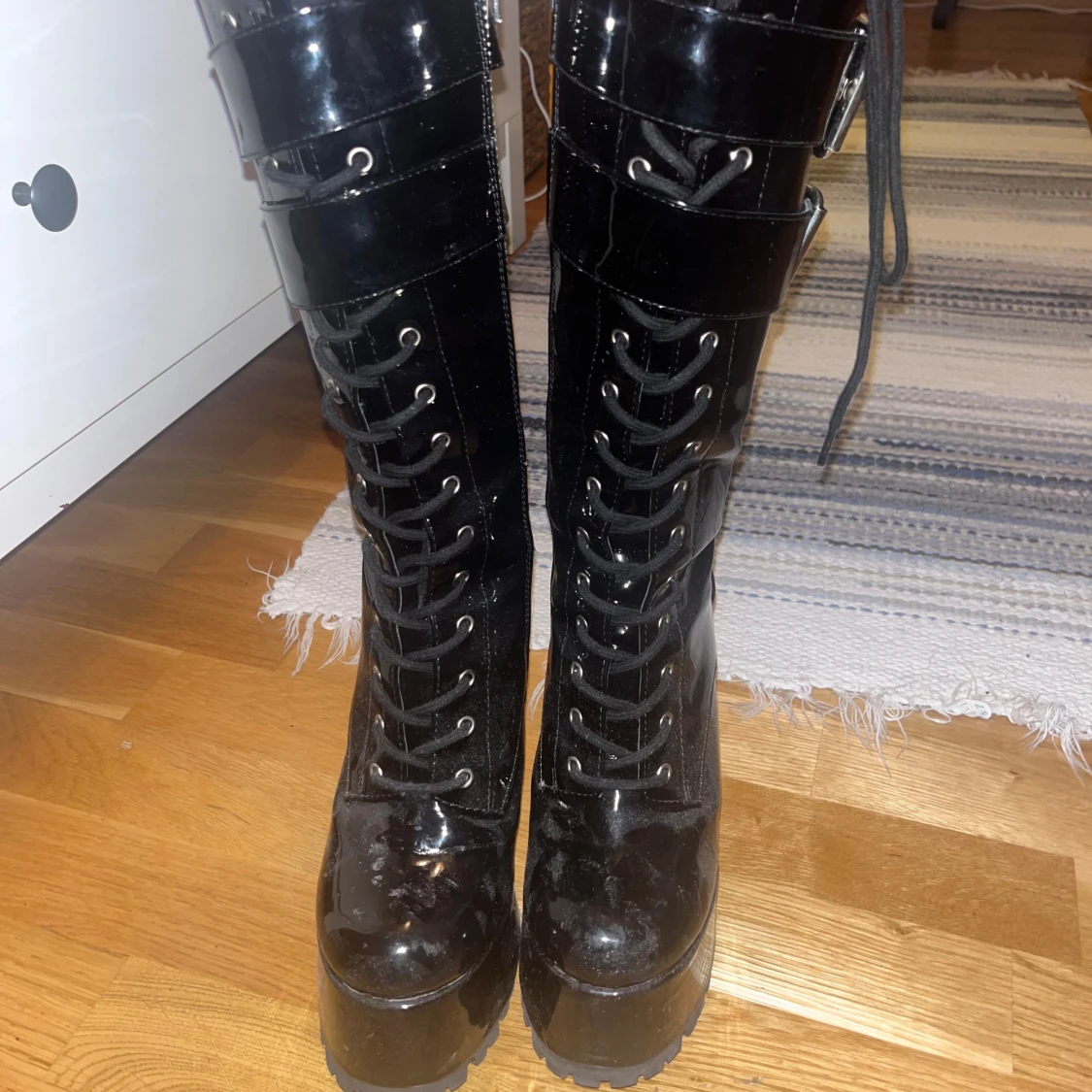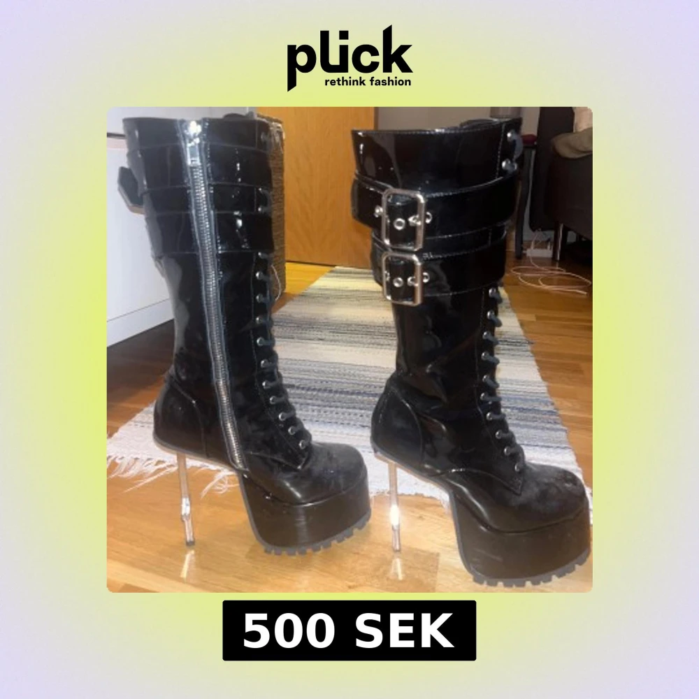 Snygga svarta platåstövlar i lack med unika korsformade klackar. Stövlarna har dragkedja samt snörning om man vill ha smalare eller större vid smalbenen så passar många! Köpte på Dollskill typ 2 år sen men har nog bara använt 2-3 ggr max. Är lite dammiga men polerar självklart upp dem innan frakt!