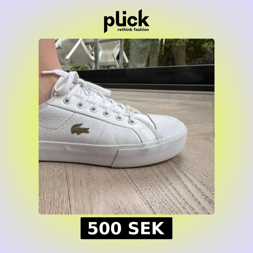 Säljer ett par fräscha vita sneakers från Lacoste med guldfärgad krokodillogga på sidan. Skorna har snörning och är tillverkade i skinn med en klassisk rund tå och platt sula. Perfekta för en stilren och sportig look. Nypris: 1200kr. Skorna är endast använda en gång.