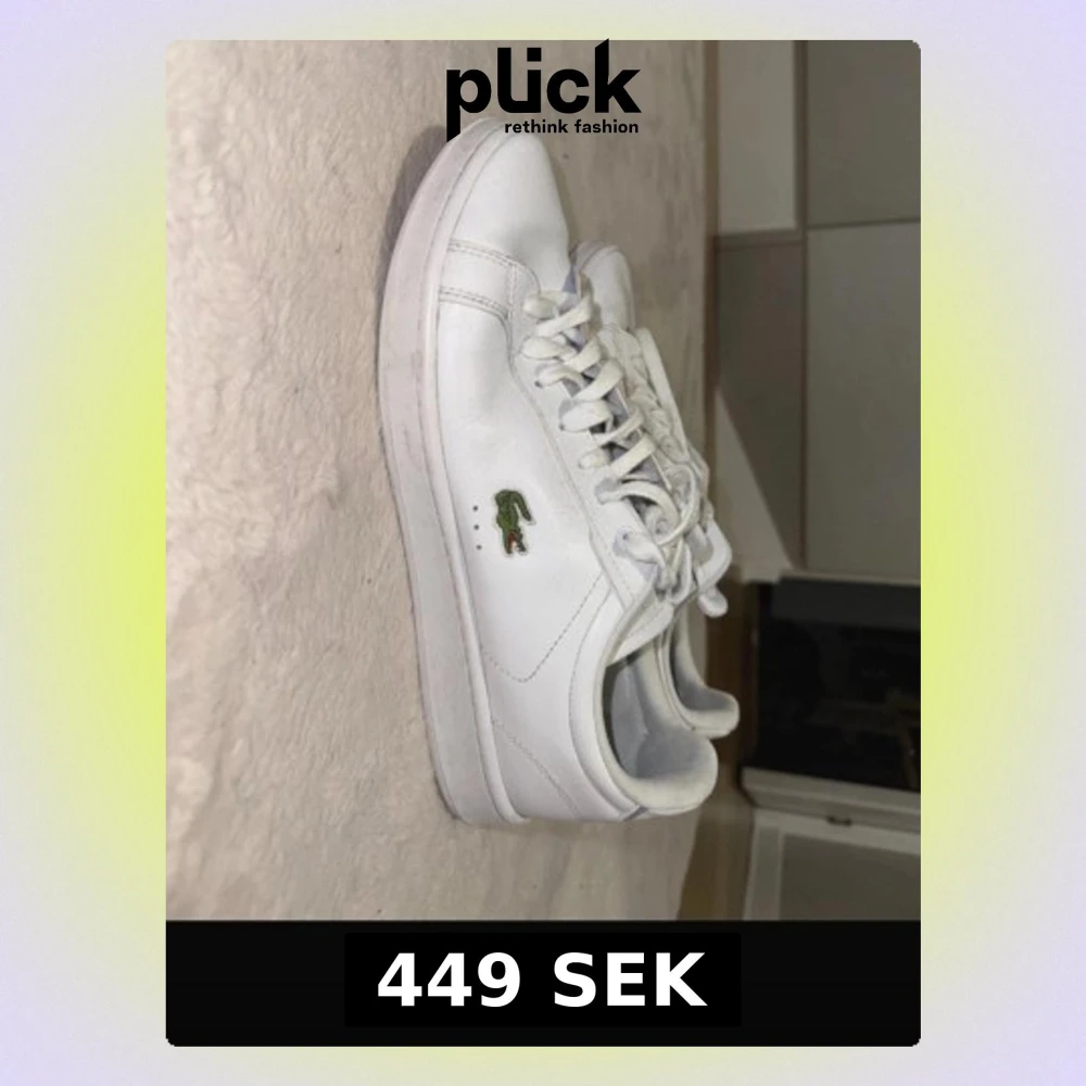 Säljer ett par klassiska vita sneakers från Lacoste i skinn med snörning. Skorna har den ikoniska gröna krokodilen på sidan och Lacoste-logga på plösen och hälen. Stilren design med rund tå och platt sula, perfekta till jeans eller shorts. Passar