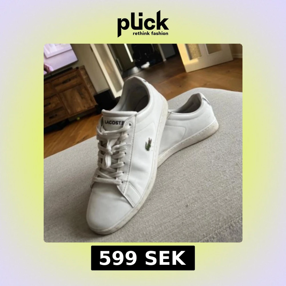 Säljer ett par klassiska vita sneakers från Lacoste med snörning och den ikoniska gröna krokodilloggan på sidan. Skorna har rund tå och platt sula, perfekta för en stilren vardagslook.