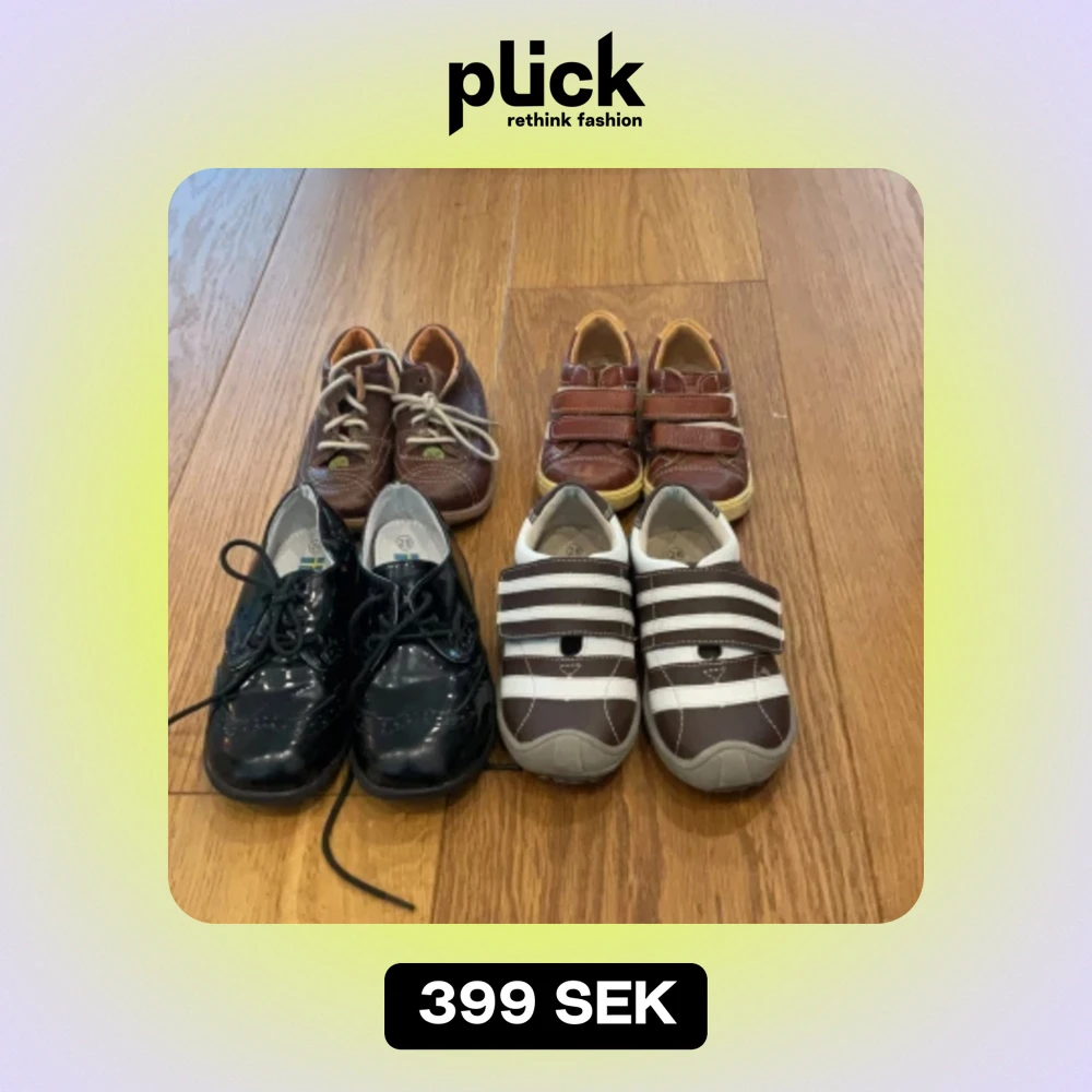 Säljer fyra par av barnskor. Glansiga Vincent: 29, Randiga Vincent: 28, Kavat utan snöre: 25, andra kavat står ej men gissar ca 23. Båda kavat äkta läder.