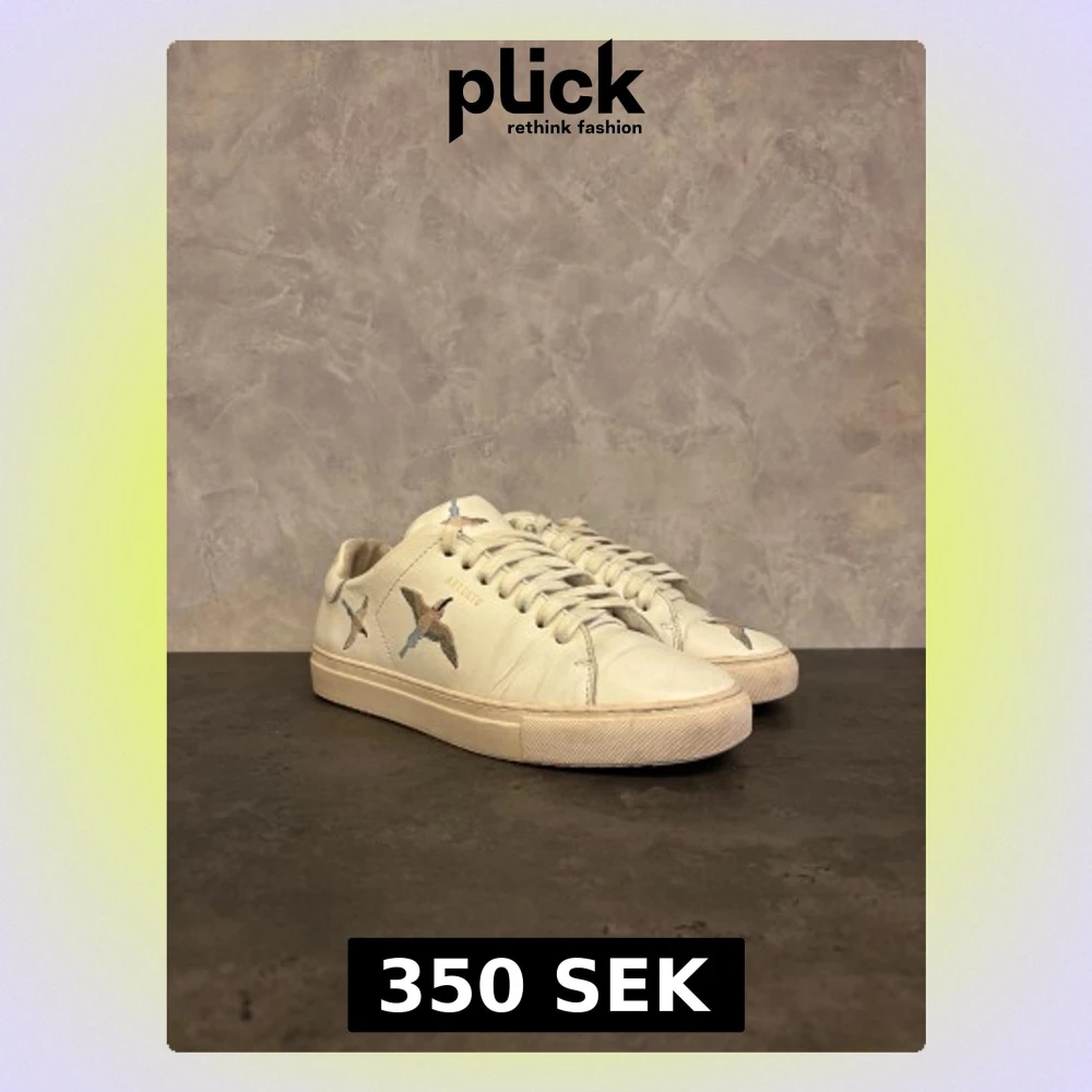 Säljer ett par vita sneakers från Axel Arigato med Beebird design på sidorna och ovansidan. Skorna har rund tå, platt sula och snörning. Tillverkade i skinn med en stilren och minimalistisk design, perfekt för dig som gillar detaljer.