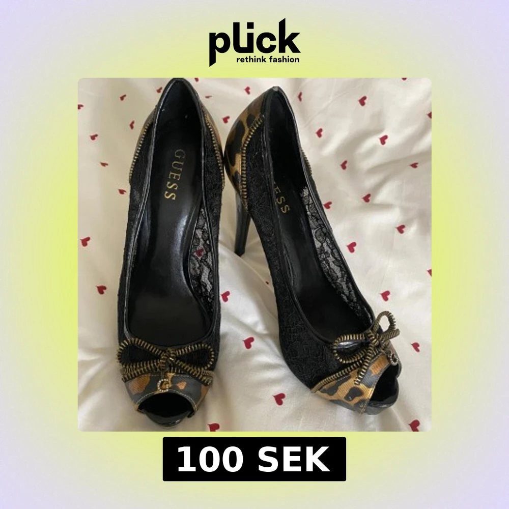 !!DISKUTERBART PRIS!! ❣️Säljer dessa otroligt vackra vintage Guess klackar för att de tyvärr är för stora😢Skorna har öppen tå, hög klack och en dekorativ dragkedja formad som en rosett framtill. De har även leopard mönster, rosetter, spets, berlocker, mm. 2cm plattform fram (bekvämt att gå i) & 12cm klack. Små tecken på användning på hälarna (sista bild). Väldigt sällsynta & säljs för 4000kr på andra ställen🫣Ha detta i åtanke❤️Sexiga,vackra,snygga,unika klackar som passar till allt🤩Hör av er💞