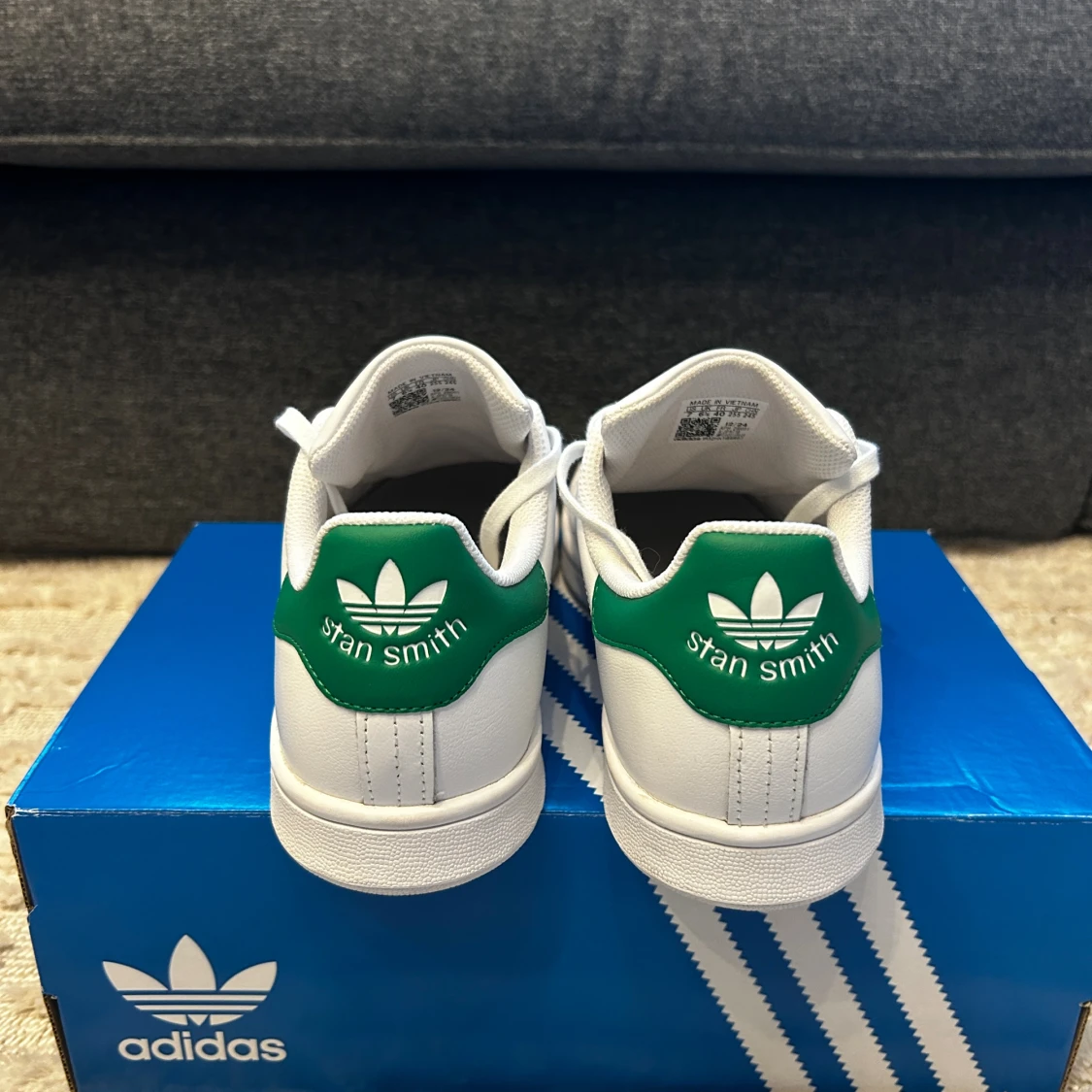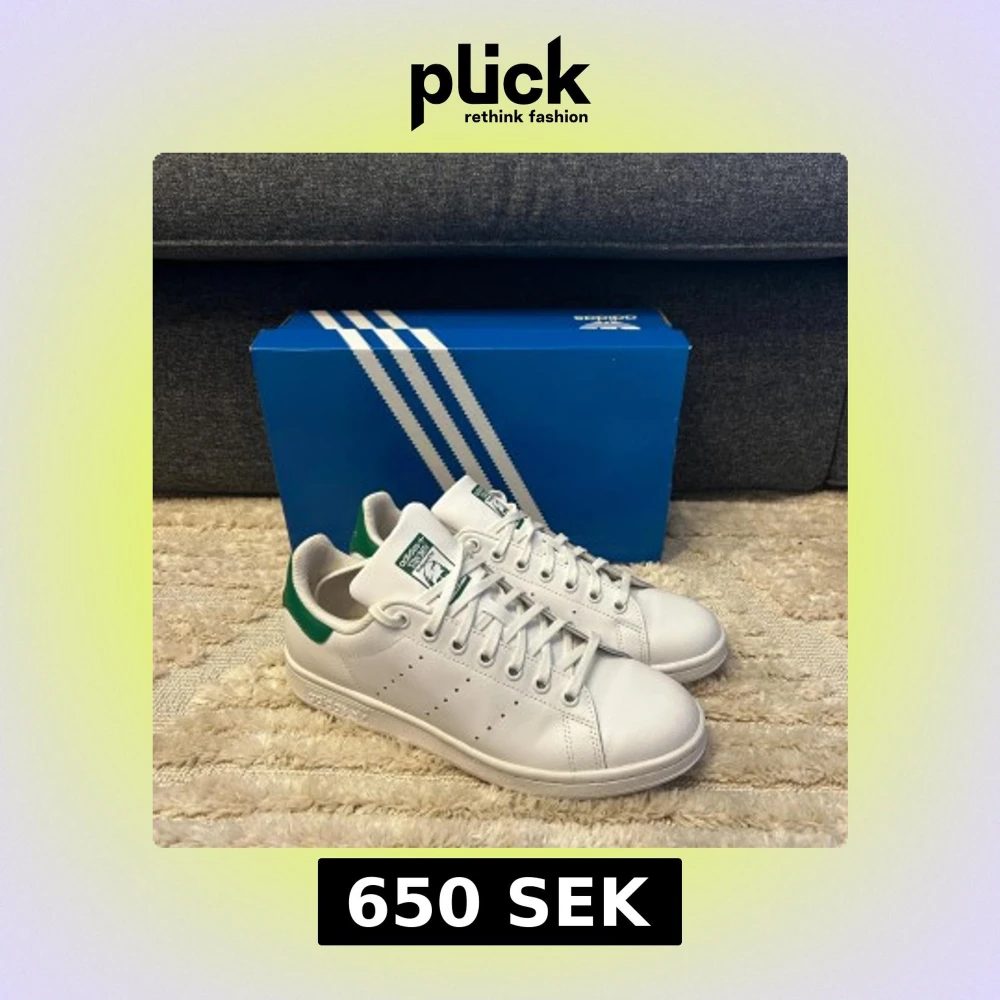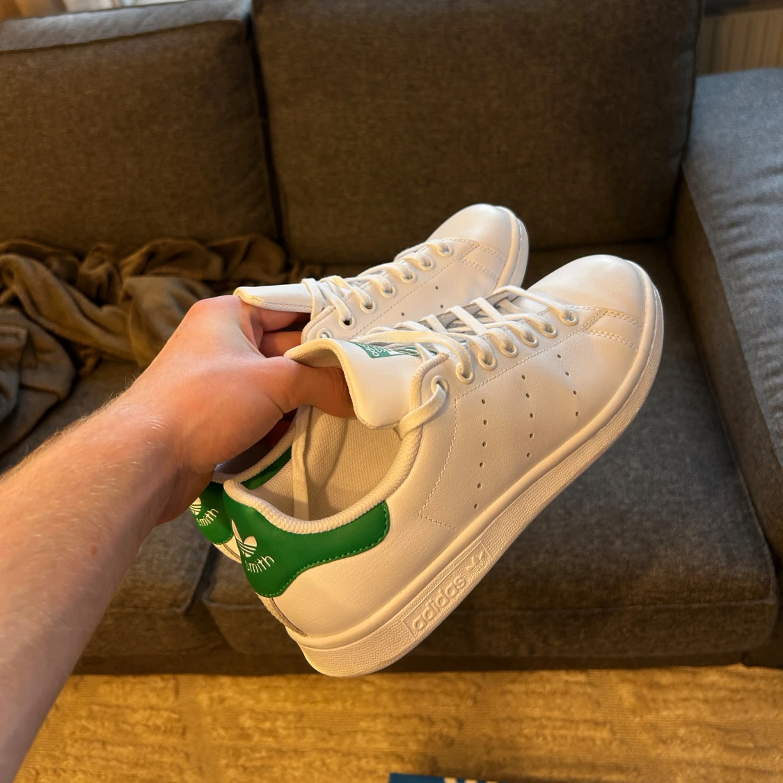 Adidas Stan Smith sneakers i klassisk vit med gröna detaljer. Bara testade 1 gång annars helt oanvända. Fråga om innemått om ni undrar.