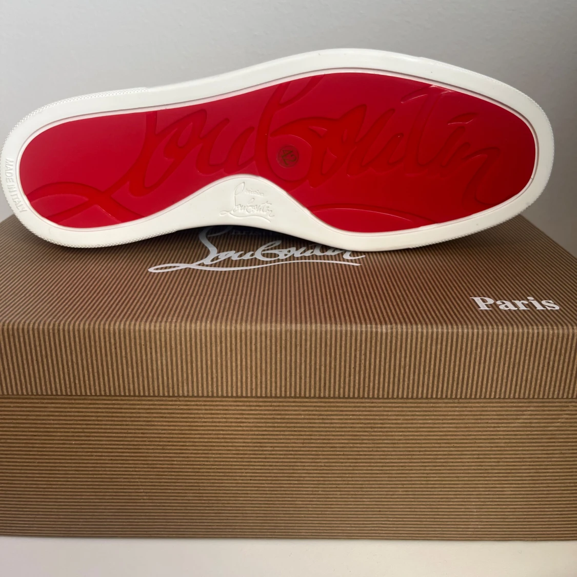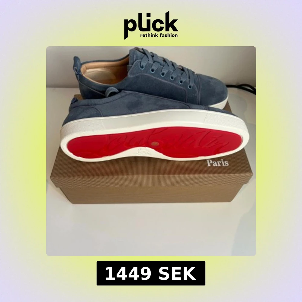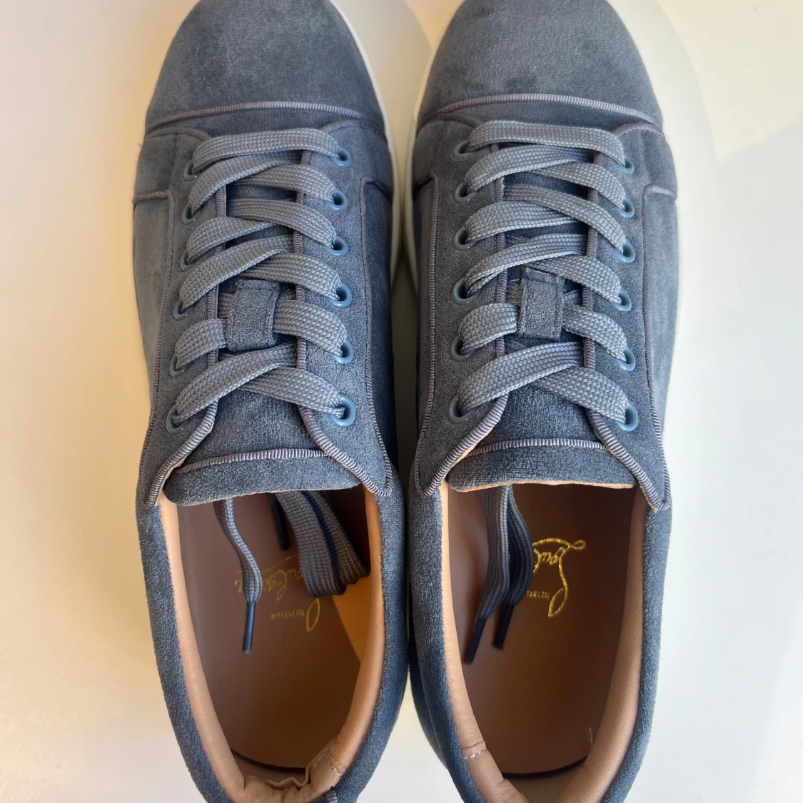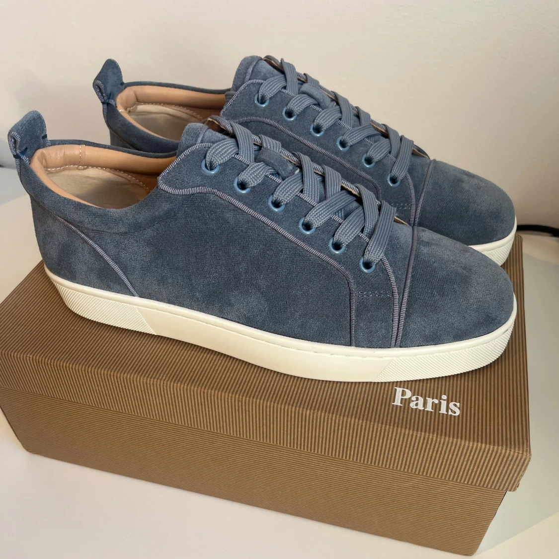 Snygga blå sneakers från Christian Louboutin i mjuk mocka med klassisk röd sula och vita kanter. Skorna har rund tå, snörning och beige innersida i skinn. Kommer med originalkartong och tre dustbags.Perfekt för dig som gillar exklusiva detaljer och stilren design. Priset kan sänkas vid snabb affär😊