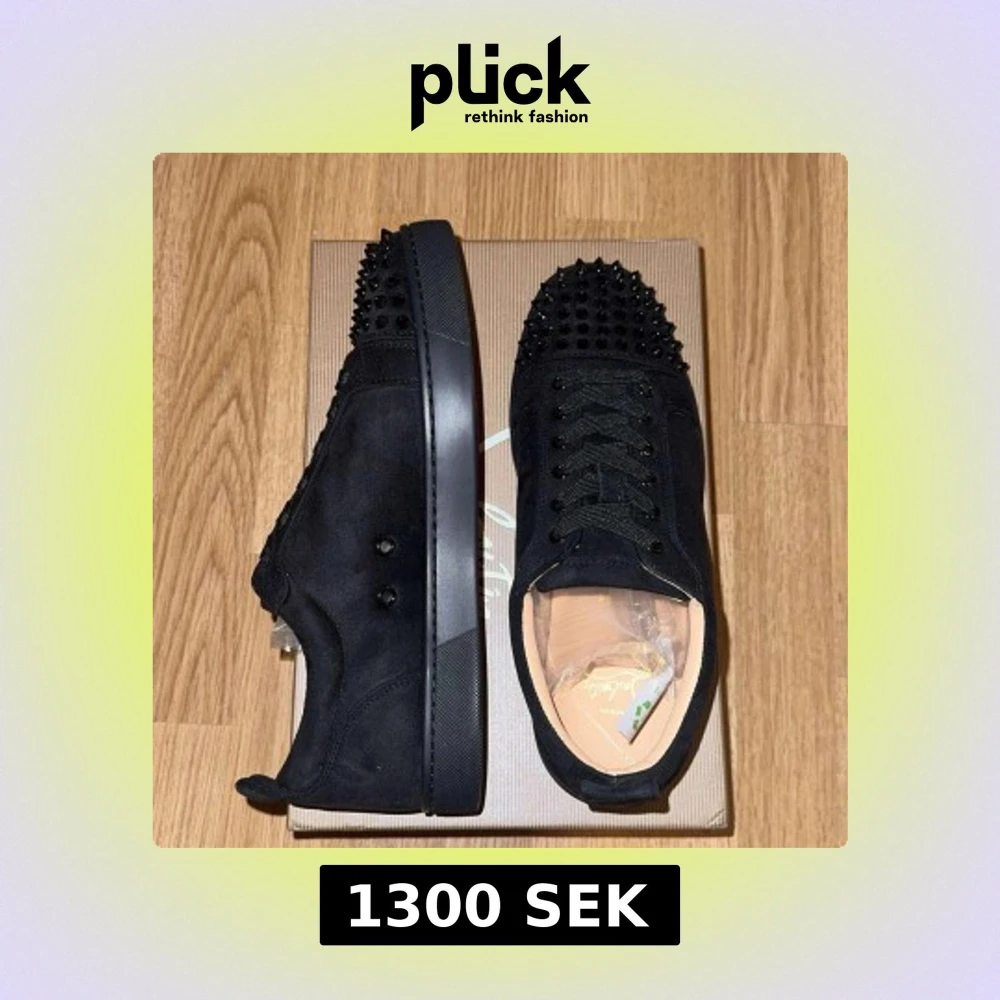 Säljer ett par helsvarta sneakers med snörning och rund tå. Skorna har mattsvart mocka och är dekorerade med svarta nitar över tån för en edgy look. Platt sula och diskret design på sidorna. Perfekta för dig som vill sticka ut.