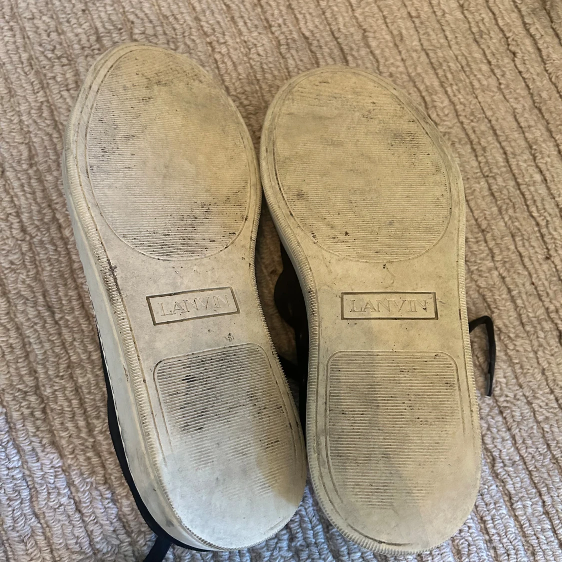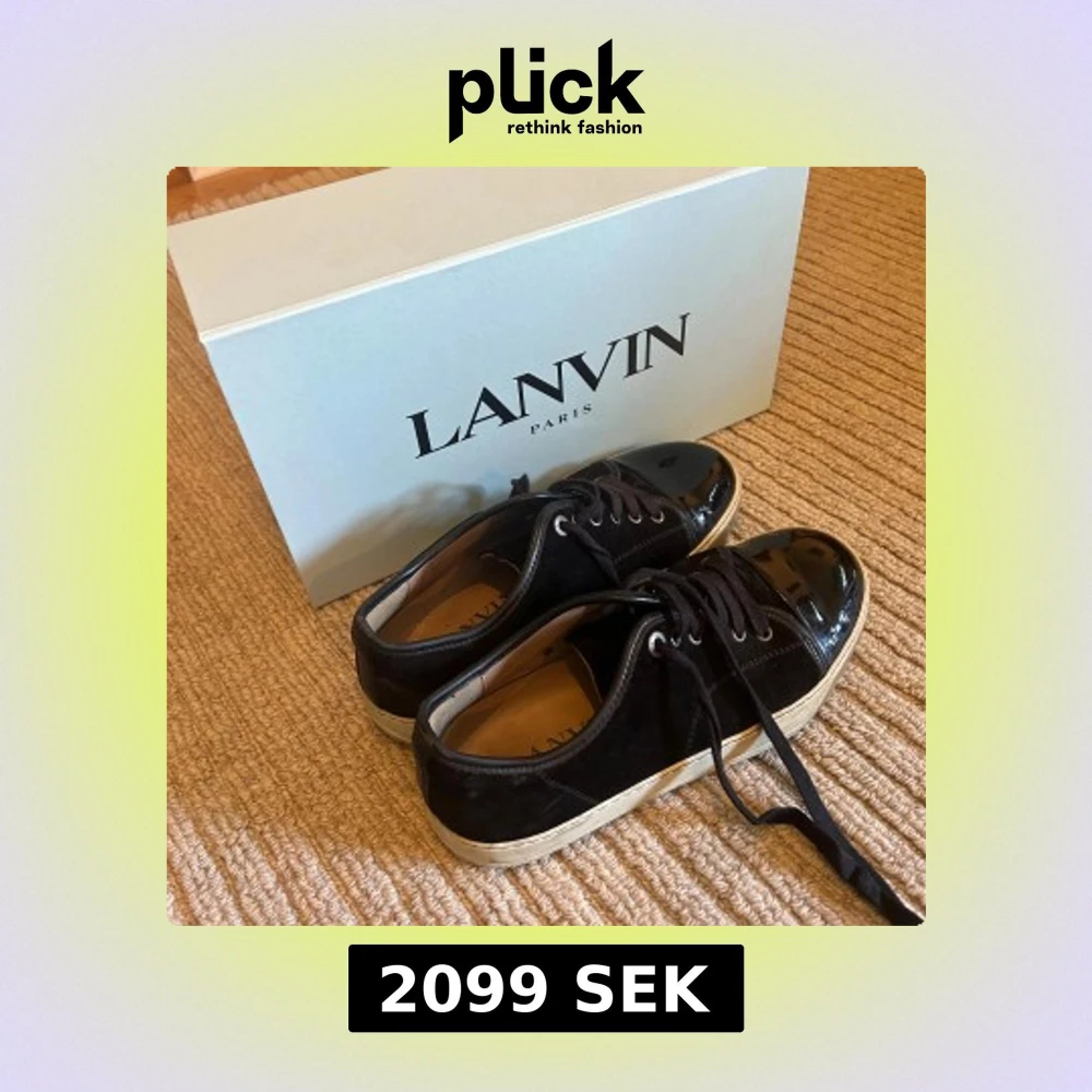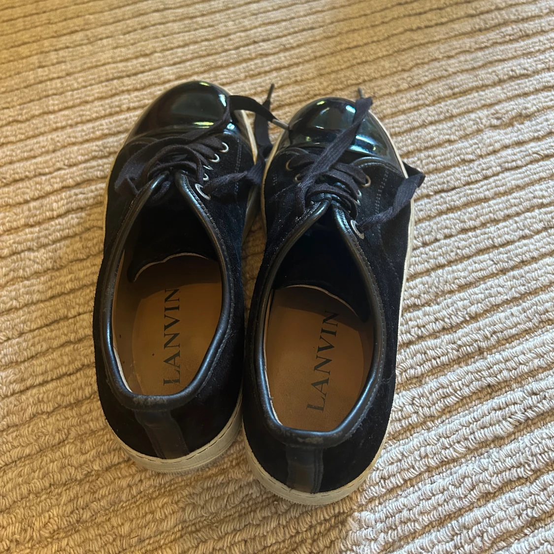 Snygga svarta sneakers från Lanvin med klassisk snörning och unik lackad tå. Ovandelen är i mocka och sulan är vit och robust. Perfekta för dig som vill ha en stilren men ändå lyxig look. Skorna har rund tå och cool kontrast mellan material. Finns en liten defekt på vänster tå men inget jätte tydligt. Köpt på Care of Carl.