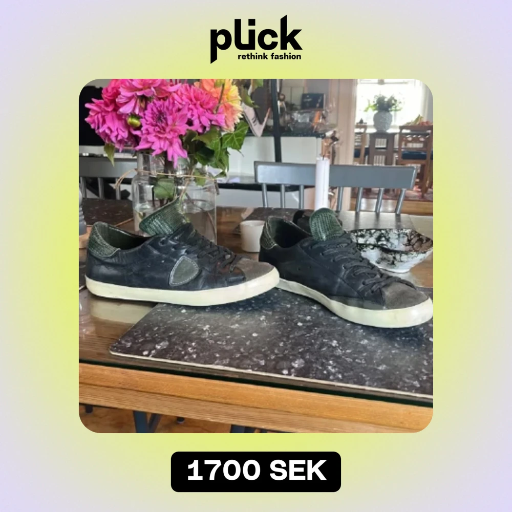 Tja! Säljer dessa phillipe model skor som är i en snygg grön färg som passar bra till hösten, dem är i väldigt bra skick och andvända fåtal gånger, dem är i storlek 40 men passar på mig som vanligtvis har 42. Medföljer dustbag. Priset kan diskuteras!
