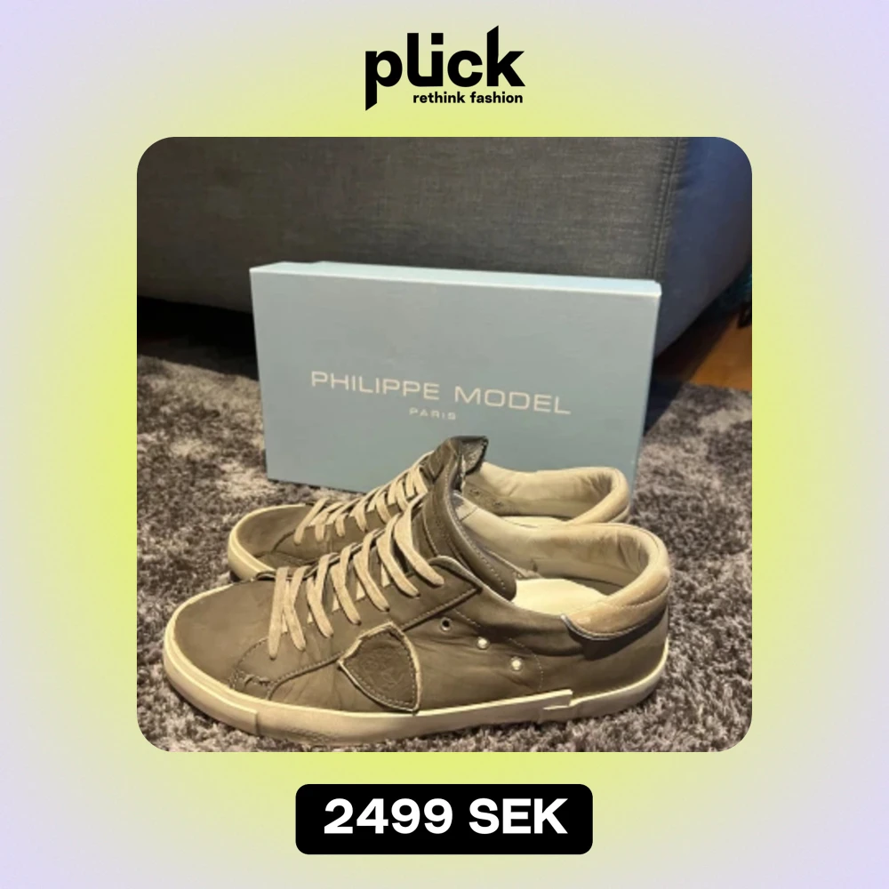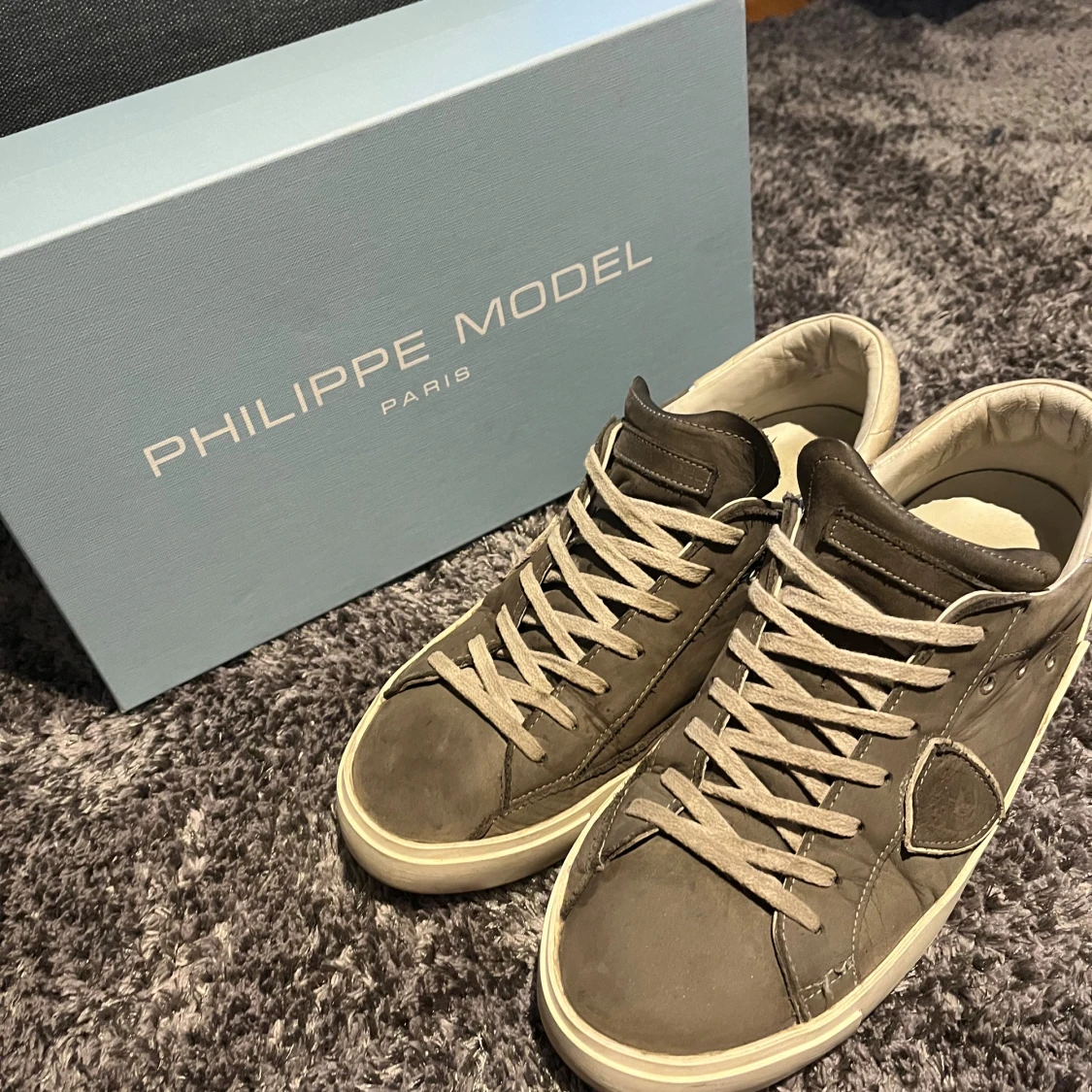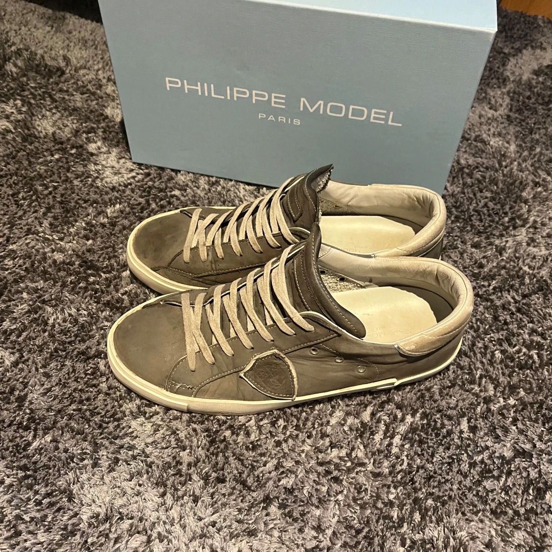 Ett par grå Phillipe Model skor i användt skick men ändå fina. Färg grå, storlek 41, köpta nya. Inte tvättade i bilden, pris går att diskuteras.