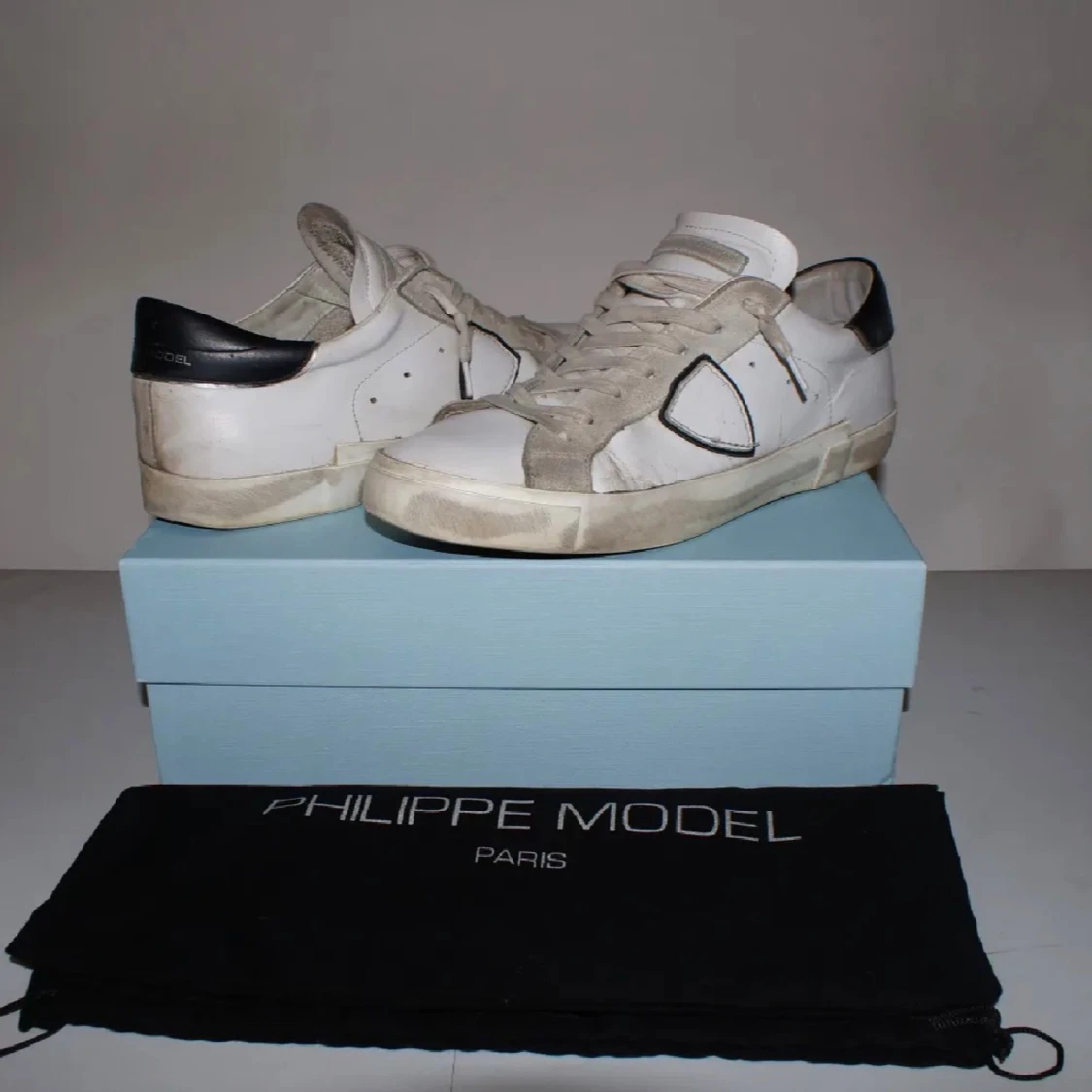 Snygga vita sneakers från Philippe Model med svart häl och grå mockadetaljer. Skorna har rund tå, platt sula och klassisk snörning. Materialmix av skinn och mocka ger en cool och lyxig vibe. Perfekt för dig som gillar stilrena och trendiga sneakers.