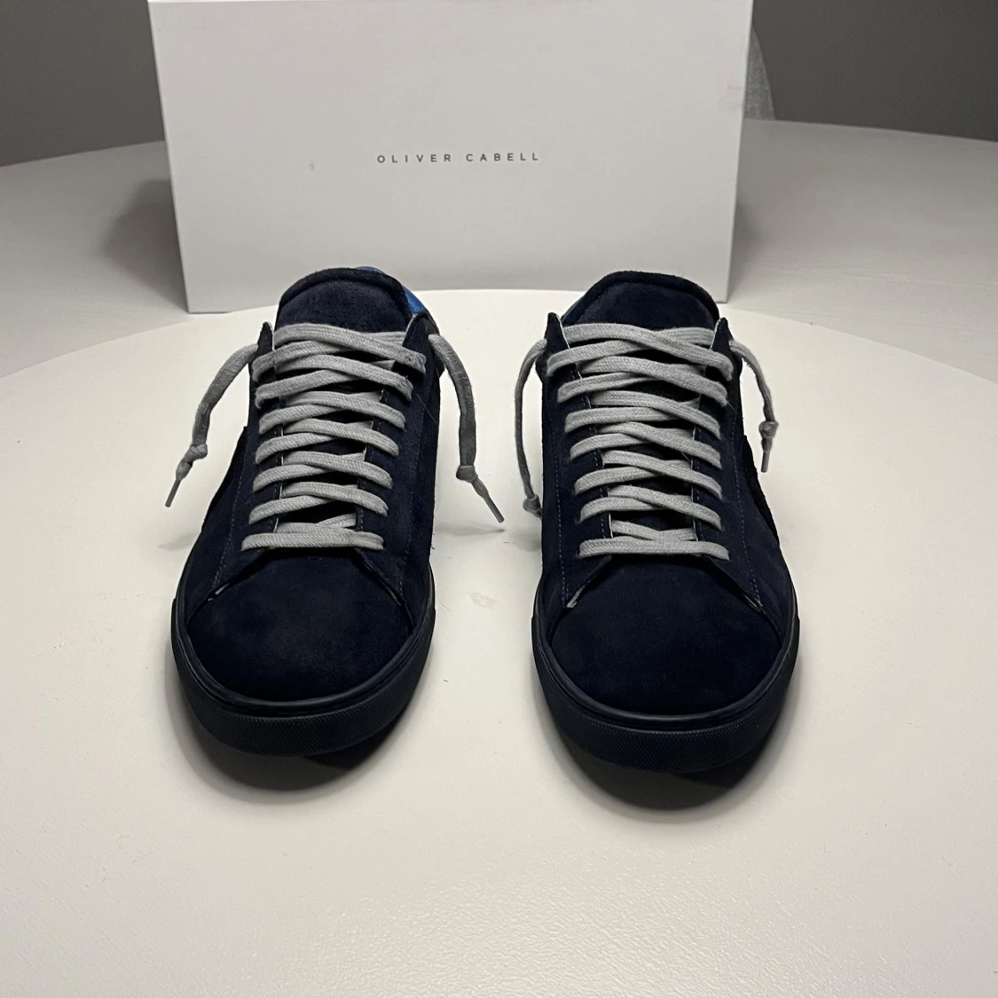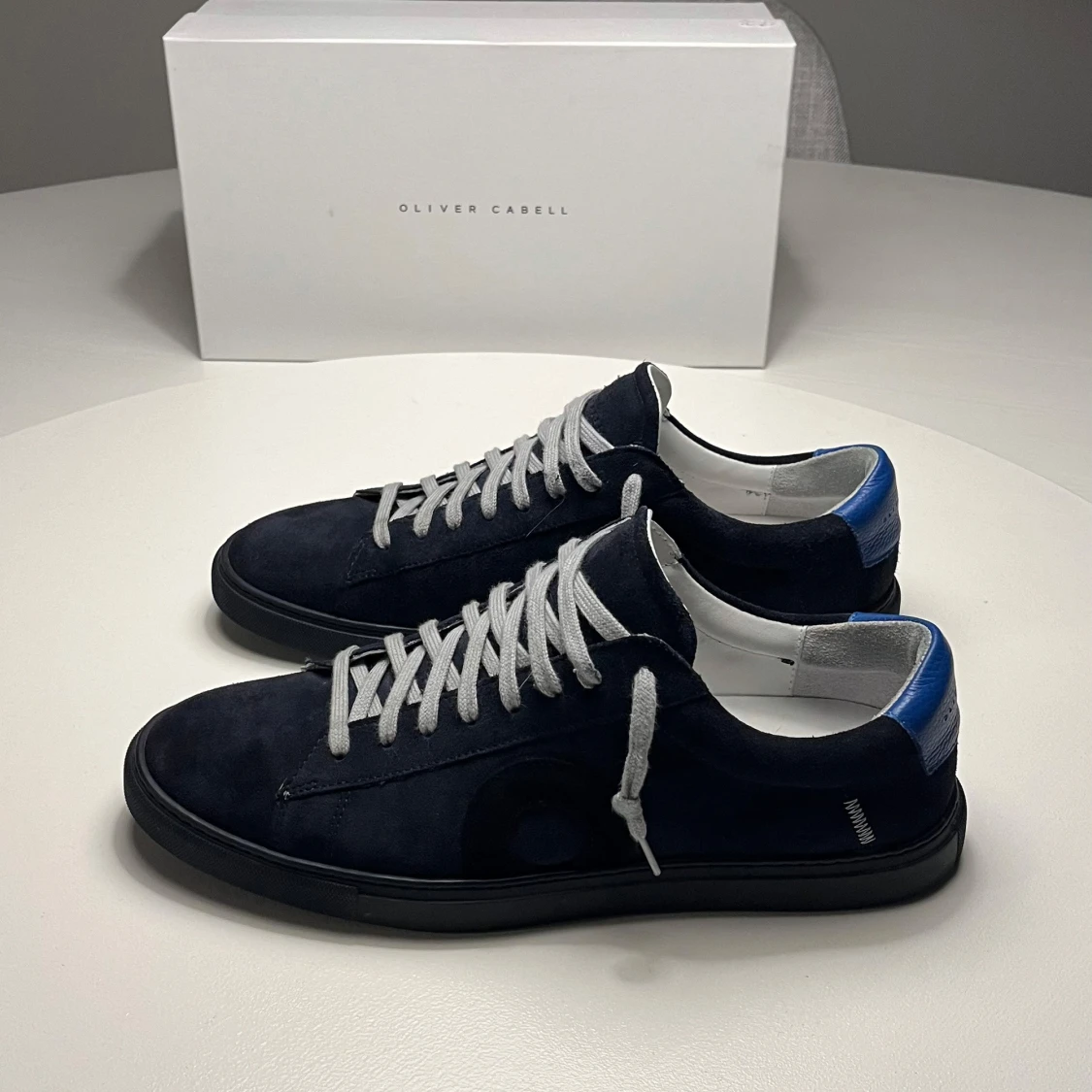 Snygga blåa sneakers från Oliver Cabell i mocka med grå snörning. Perfekta för en avslappnad och trendig look. Skorna har aldrig använts utanför dörren, därmed är skicket 10/10. Allt original medföljer. OBS kvitto finns ej!