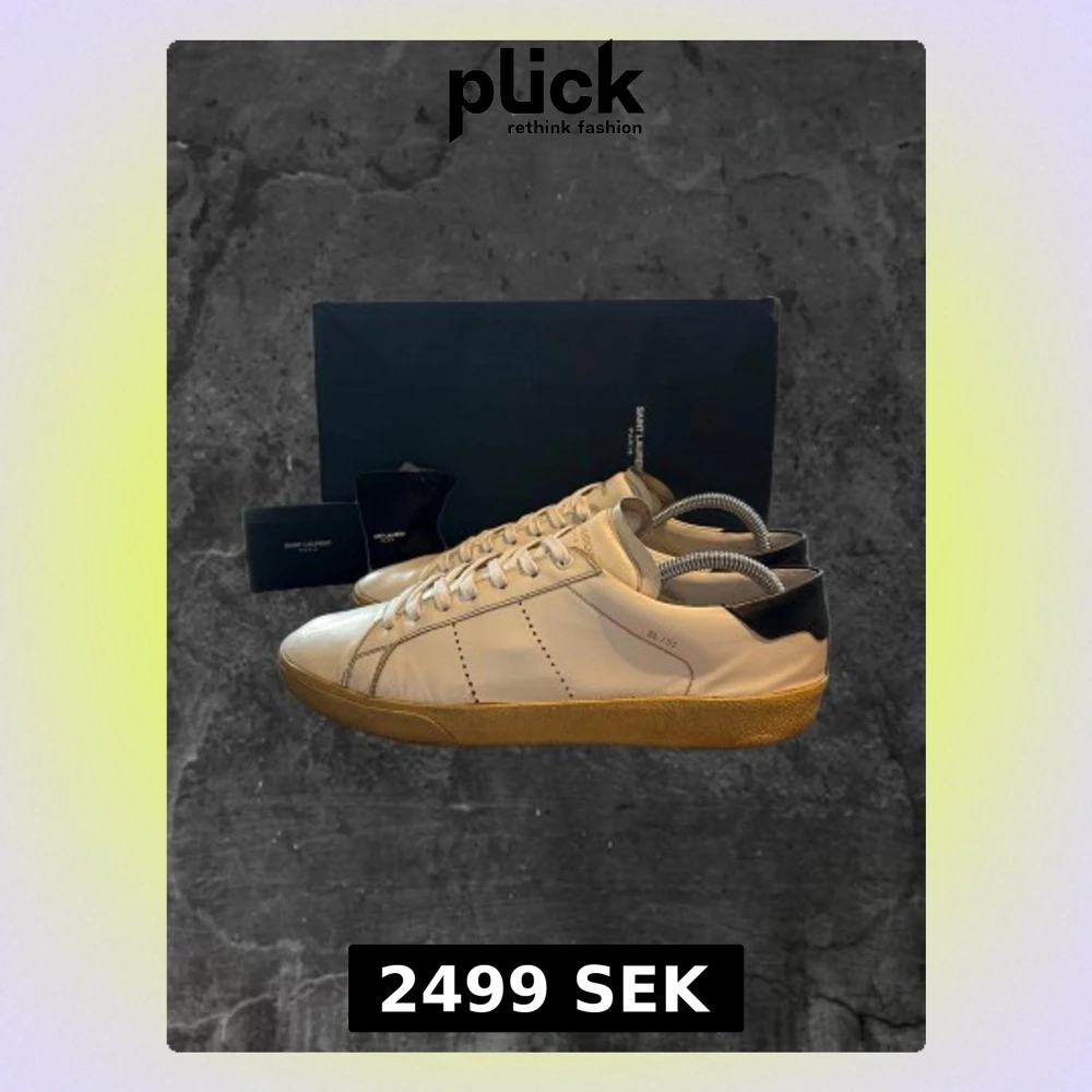 Snygga Saint Laurent SL/06 sneakers i vitt skinn med beige gummisula och svart detalj på hälen. Klassisk rund tå, snörning och diskret perforering på sidan. Märkeslogga på plösen och yttersulan. Perfekt för dig som gillar stilrena och lyxiga sneakers.