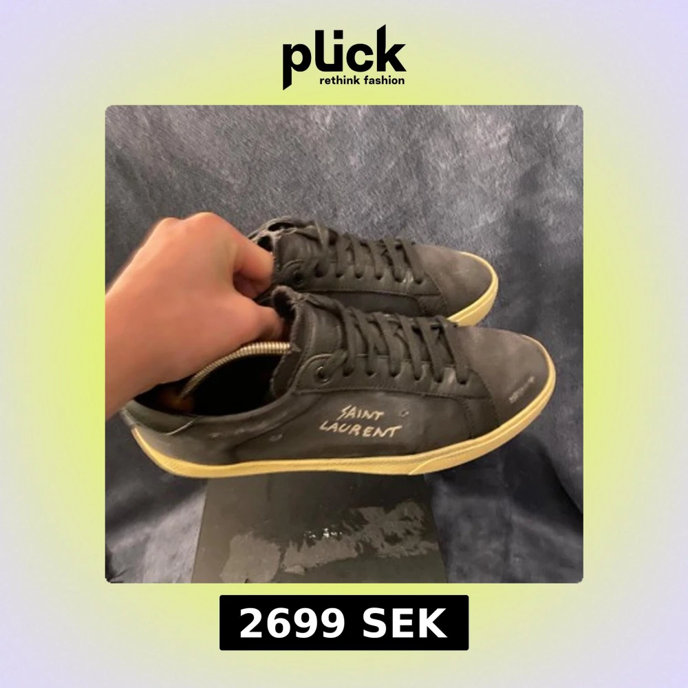 Snygga svarta sneakers från Saint Laurent med vit logga på sidan. 9/10 skick✅ men den håller i den har lossnat lite där fram på ena skon Storlek 41✅ Allt på bild fem följer med ✅🤑Skriv om ni har frågor eller funderingar priser är inte hugget i sten. Köpta av alle på TikTok privat. Såklart äkta❤️✅