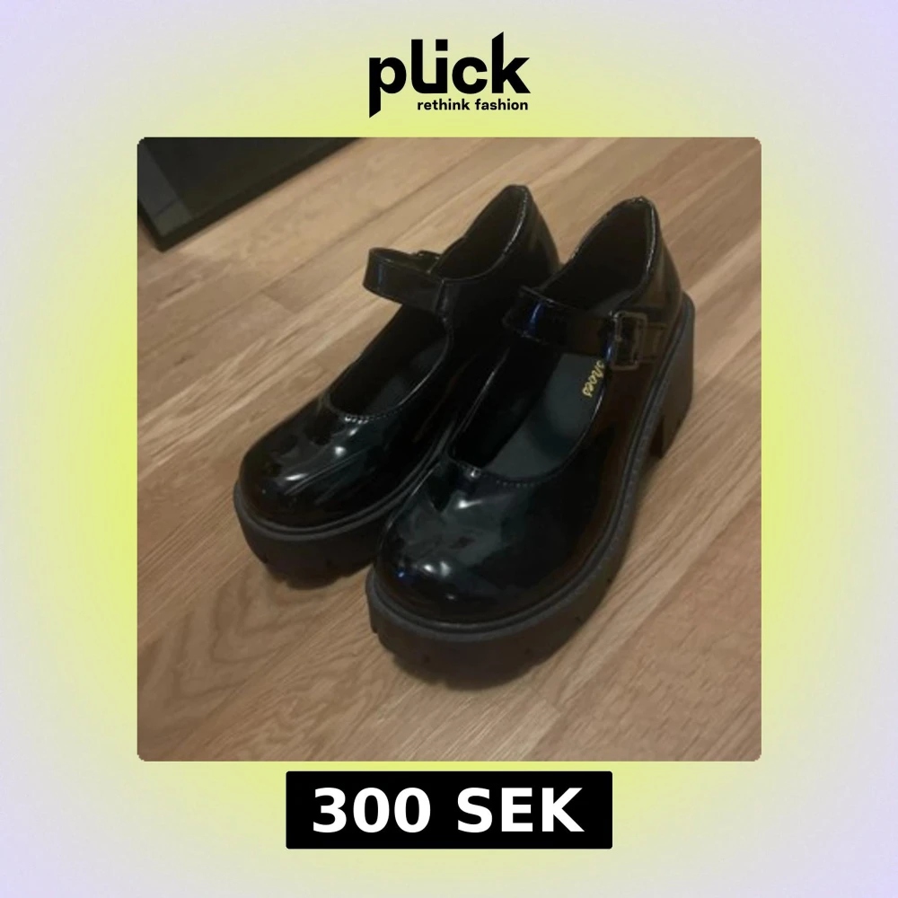 Chunky Mary Jane-inspirerade skor i svart lack med bred plattformsula och hög klack. Rem med spänne över foten och rund tå.