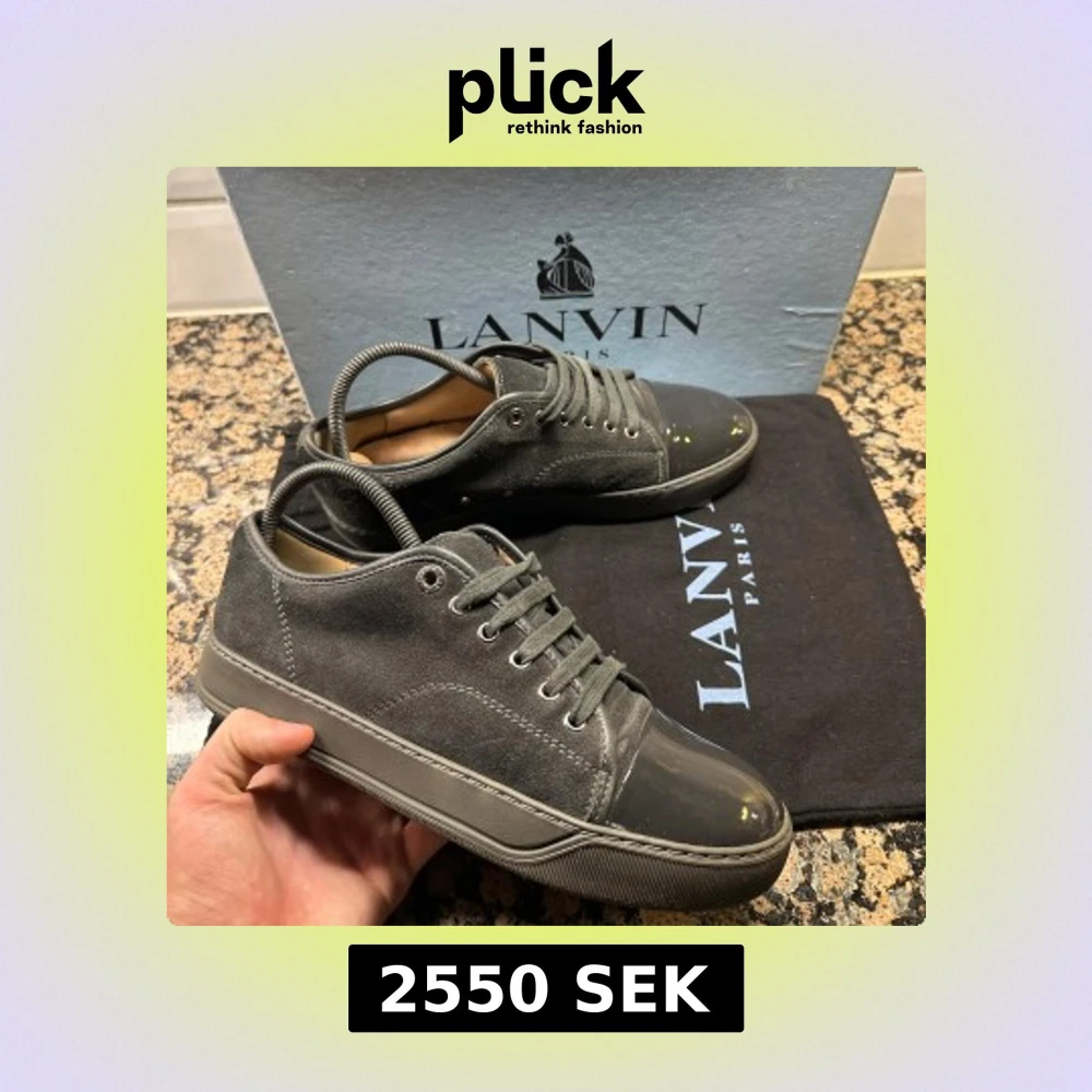 Säljer ett par grå sneakers från Lanvin med ovandel i mocka och lackad tå. Snygg och stilren design med exklusiv känsla. Limited edition. Passar dig med storlek 40-41, är storlek uk5 (Lanvin är stora i storleken). Fråga gärna-svarar snabbt! Orginal pris 5000kr+.