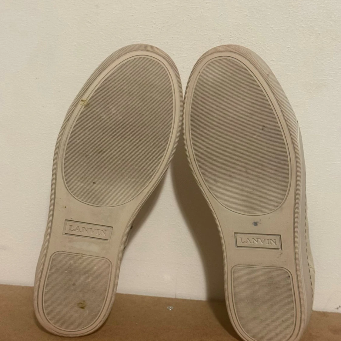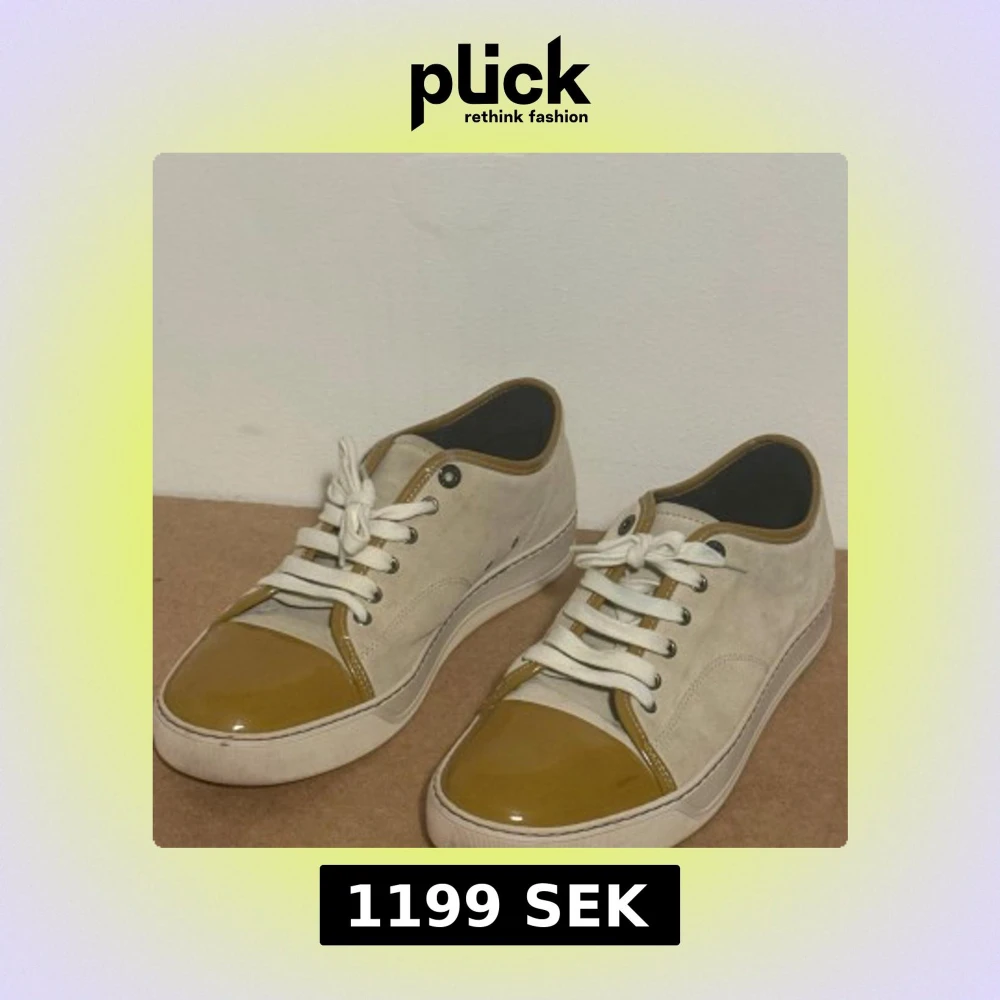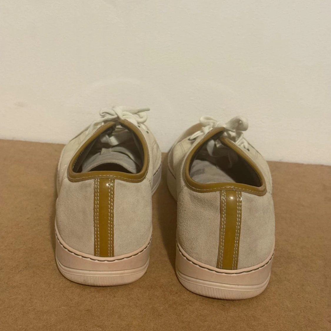 Snygga sneakers från Lanvin i beige mocka med detaljer i gul lack på tå, häl och runt öppningen. Skorna har vita snören och en klassisk platt sula. Perfekta för dig som vill ha en unik och stilren look med lyxig känsla.