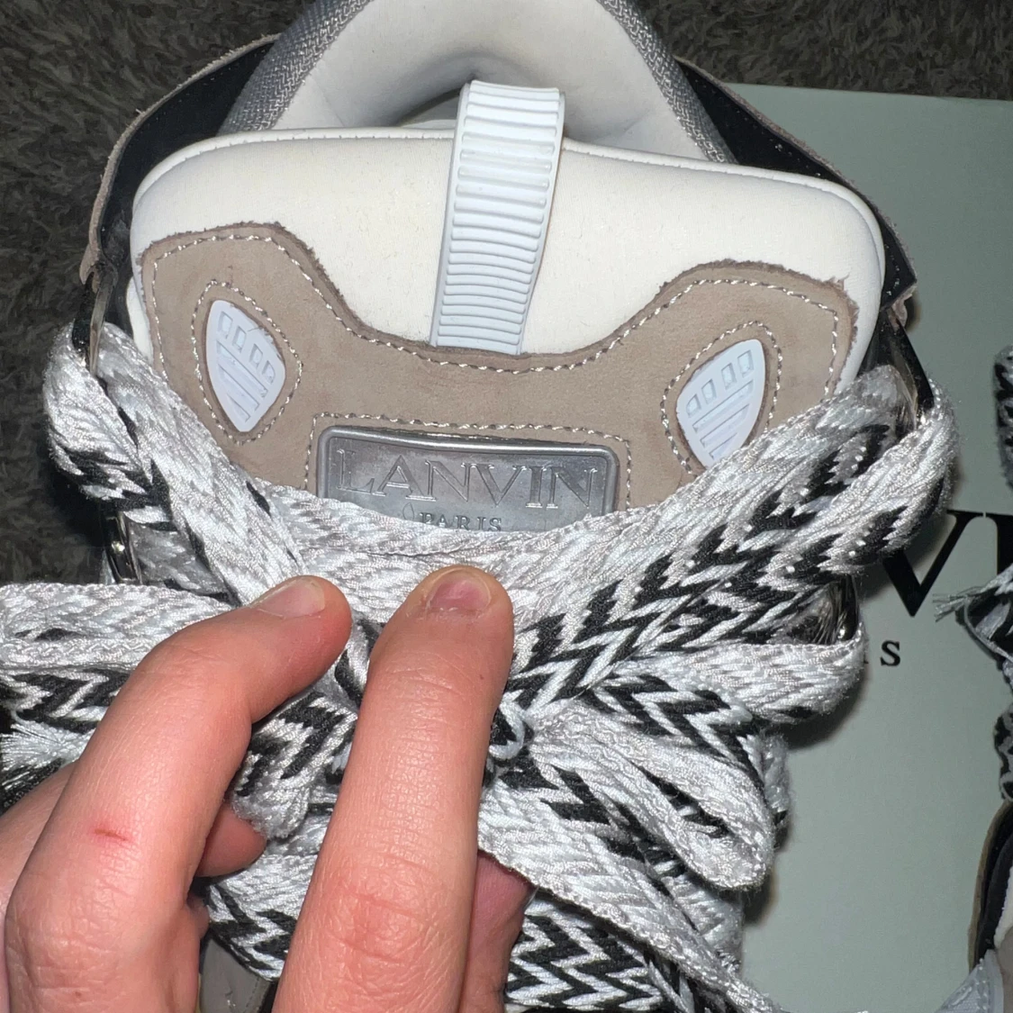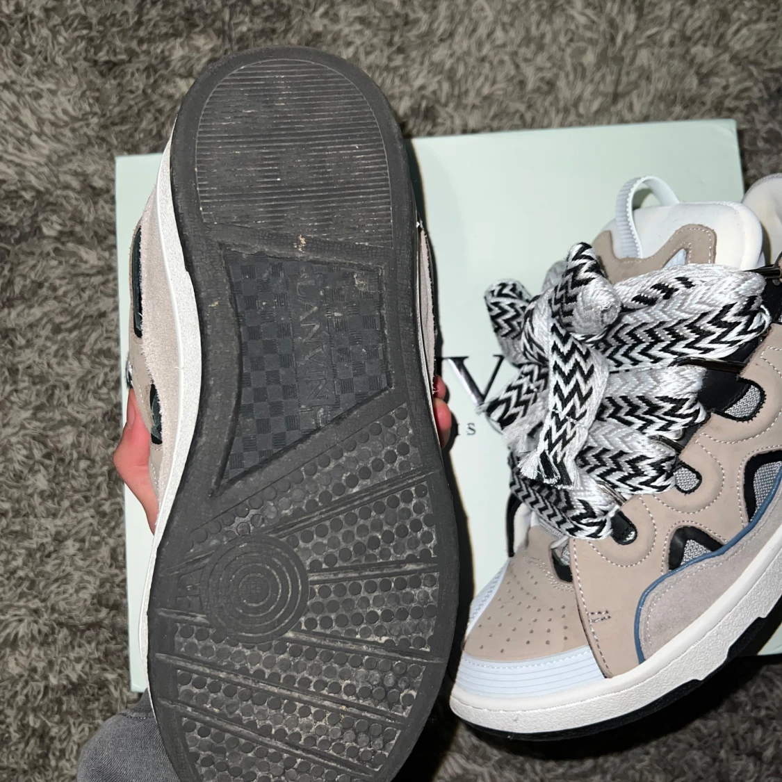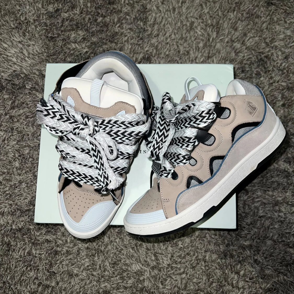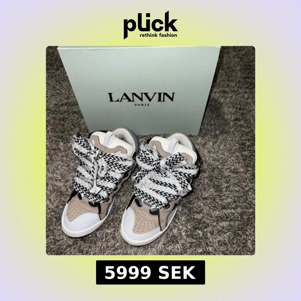 Snygga Lanvin sneakers i beige och svart med unika mönstrade snören. Skorna har en modern design med perforerade detaljer och en robust sula. Perfekta för en stilren look.
