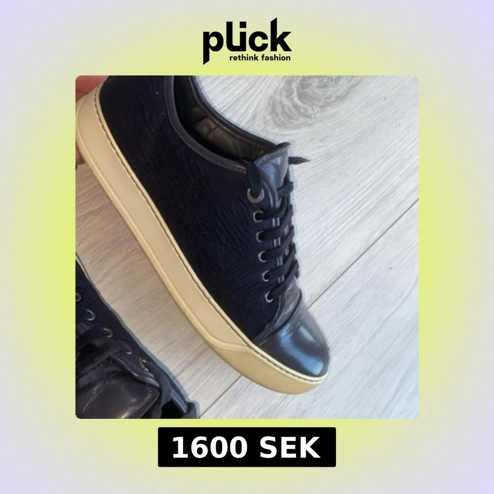 Snygga mörkblå sneakers från Lanvin med ovandel i textil och detaljer i blankt skinn på tå och plös. Skorna har svarta snören, metallöljetter och en kontrasterande beige sula. Perfekta för dig som gillar stilrena och exklusiva sneakers.