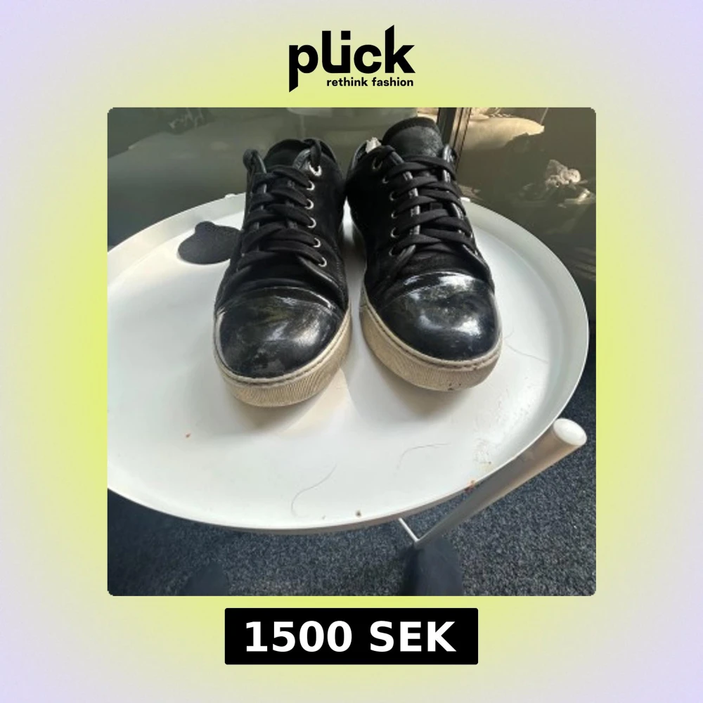 Säljer ett par svarta sneakers med snygga mockadetaljer på sidorna och blankare material på tån. Skorna har rund tå, snörning och en vit platt sula som ger en cool kontrast. Perfekt för dig som gillar stilrena och klassiska sneakers med lite edge.
