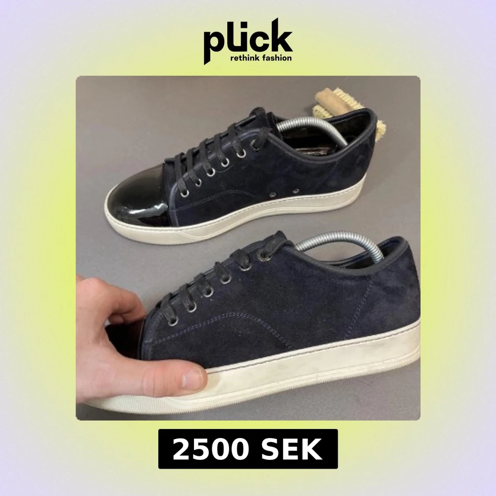 Snygga svarta sneakers från Lanvin med ovandel i mocka och en glansig lackad tå. Skorna har vita gummisulor och svarta skosnören. Perfekt för dig som gillar en stilren men ändå unik look. Kan tänka mig byte om det är skor i bra kvalité och äkta och samma prisklass helst Svart, vit eller grå