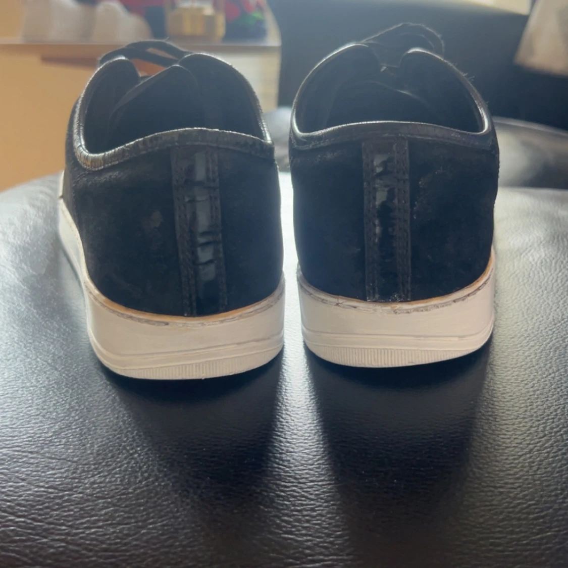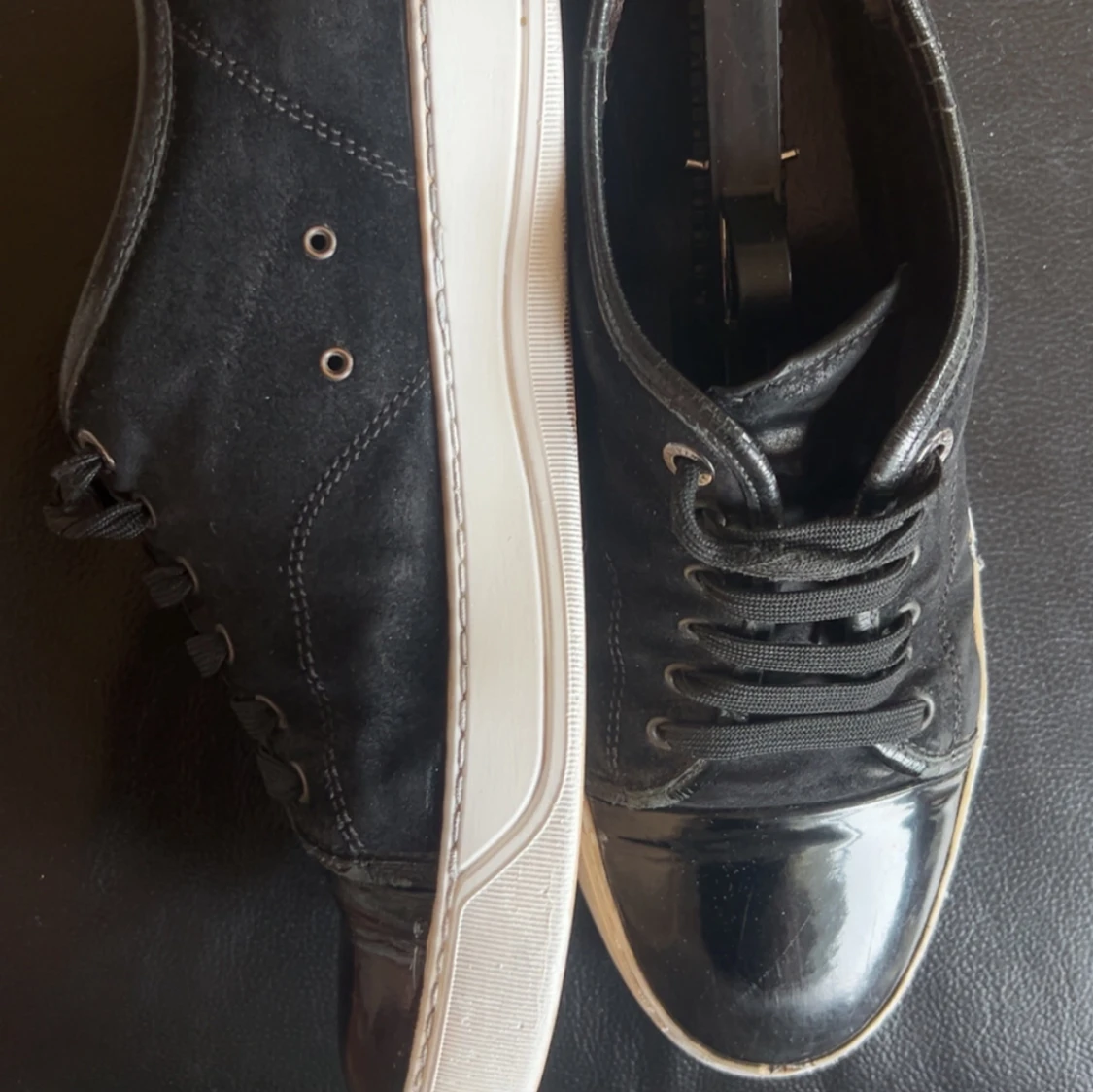 Snygga svarta Lanvins med vit sula och lackad tådel. Ovandelen är i mocka och skorna har klassisk snörning. Perfekta för dig som gillar en stilren look med en twist. Passar till det mesta och är riktigt bekväma. Skicket är bra. De har används men har fof mycket kvar att ge. mockan är trött men de går nog att fixa med en mockaborste om man orkar göra det. jag har inte haft orken. Sulan är målad.
