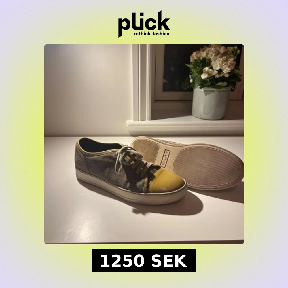 Snygga sneakers från Lanvin i grå mocka med gul lackad tå och gul kant runt öppningen. Klassisk låg modell med vita snören och vit sula. Perfekt för dig som vill sticka ut med en unik färgkombo och exklusiv känsla. Priset är ej hugget i sten!