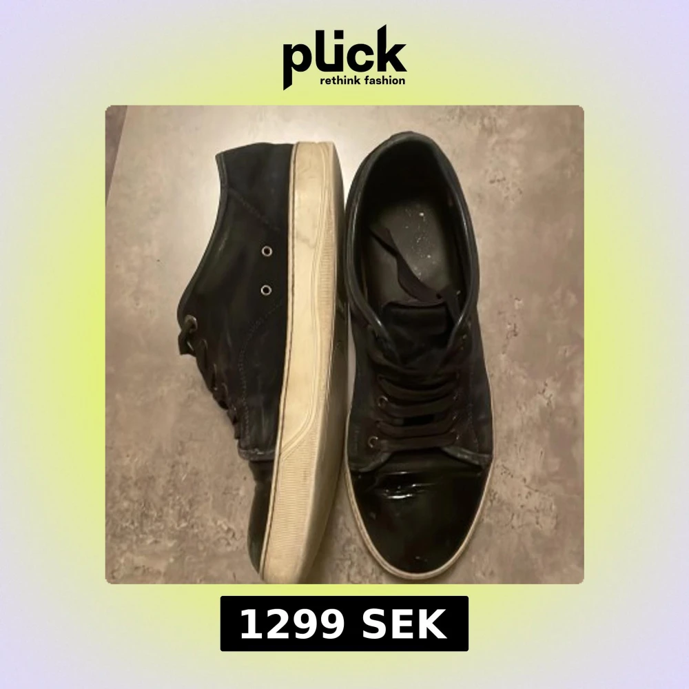 Snygga svarta sneakers från Lanvin med en stilren design. Skorna har en blank tå och snörning framtill. Säljs billigt pga skadorna där fram! För fler bilder kom priv🤝