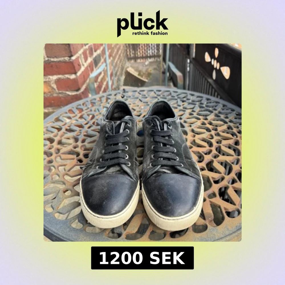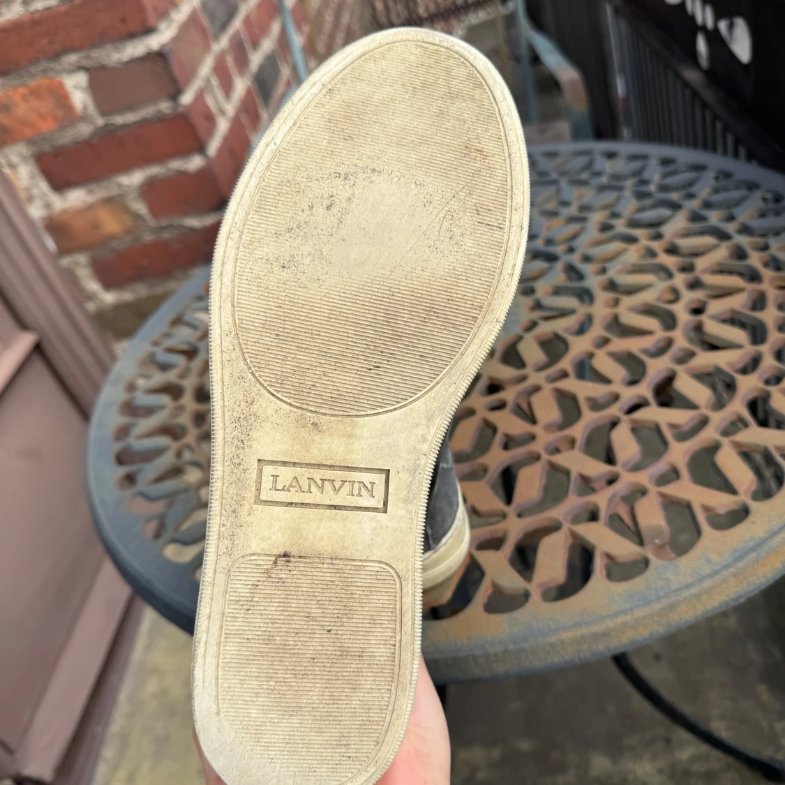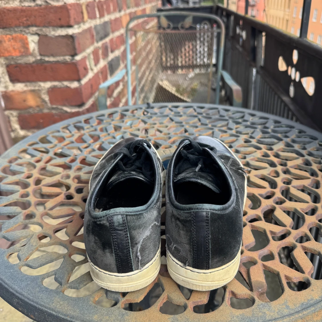 Speciella svarta sneakers från Lanvin med ovandel i mocka och detaljer i skinn. Skorna har en speciell mocka som man kan se i bild 1 omvandlas i olika ljus