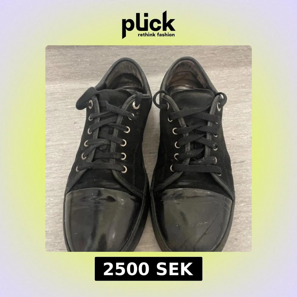 Säljer Svarta sneakers med märket lanvin, snörning och rund tå. Skorna har en snygg kontrast mellan mockaliknande material på ovandelen och en glansig, lackad tå. Metallfärgade öljetter och platt sula ger en clean och stilren look. Perfekta för dig som gillar minimalistisk stil.