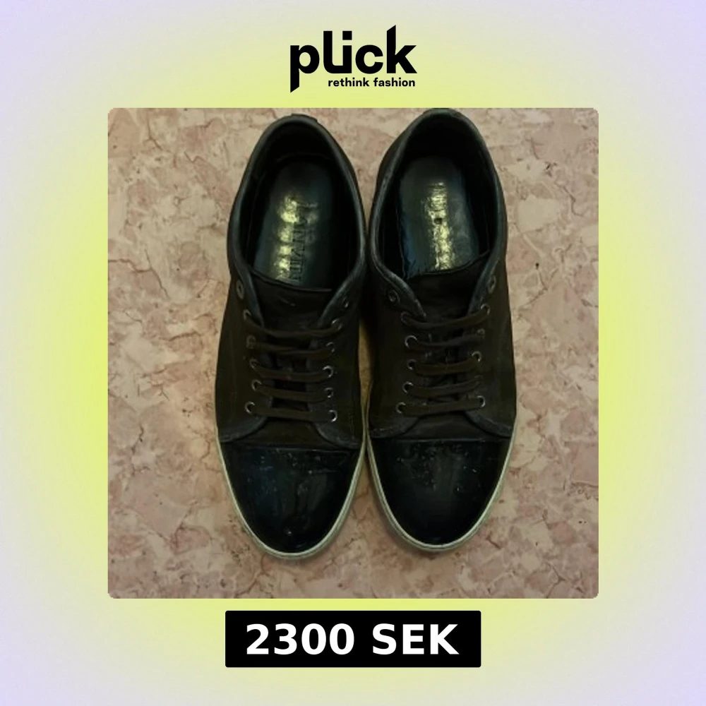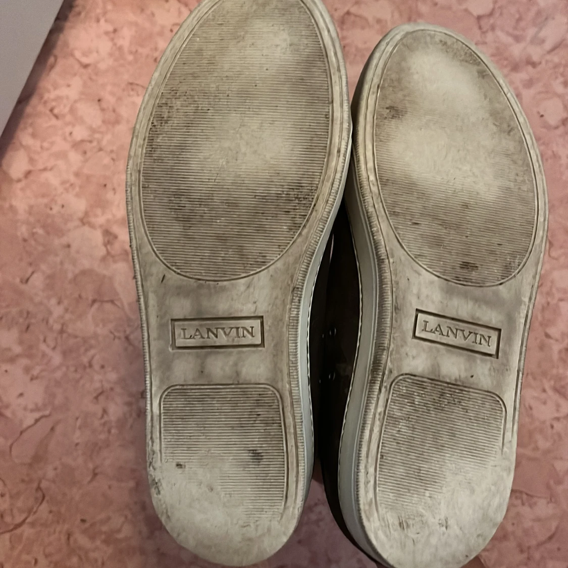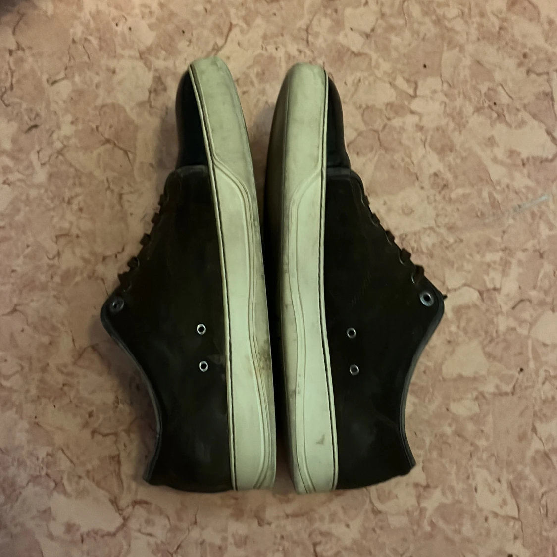 Snygga svarta sneakers från Lanvin med klassisk vit sula och rund tå. Ovandelen är i skinn och tån är i blankt material för en cool kontrast. Skorna har bruna snören och diskreta metalldetaljer vid snörningen. Perfekta för dig som gillar stilrena och lyxiga sneakers.