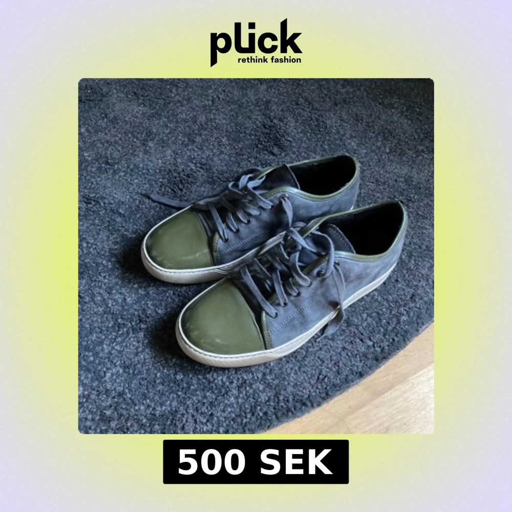 Säljer ett par snygga sneakers i grå mocka med gröna detaljer på tån och hälen. Skorna har snörning och vit platt sula. Perfekta för en stilren vardagslook. Dem är lite mer slitna än på bilderna