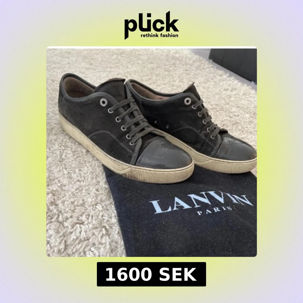 Snygga svarta sneakers från Lanvin Paris med ovandel i mocka och tåparti i blankt material. Skorna är i väldigt fint skick bara lite smutsiga just nu har inte haft ork att tvätta dom, men tvättas själv klart innan frakt. Dustbag hängs me på köpet, mer bilder går att få bara att skriva. Priset är inte hugget i stenen som sagt.😊
