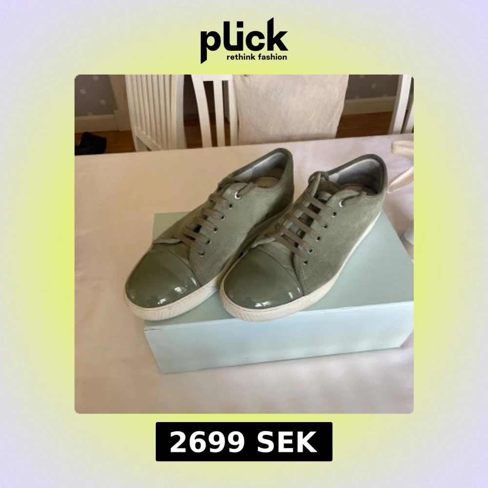 Säljer ett par olivgröna sneakers från Lanvin med snygg snörning och rund tå. Skorna har en unik glansig tådel i samma färg och en vit platt sula. Perfekta för dig som vill ha något stilrent men ändå sticker ut. Box ingår