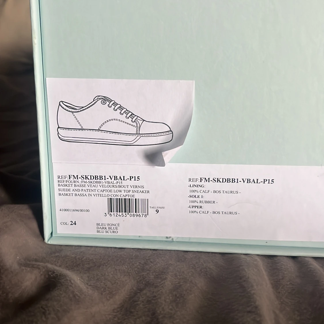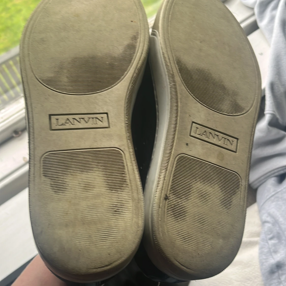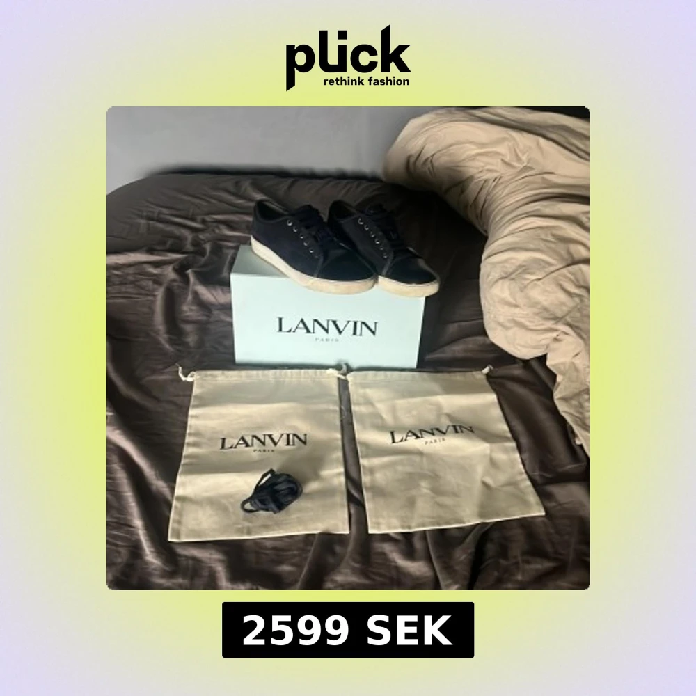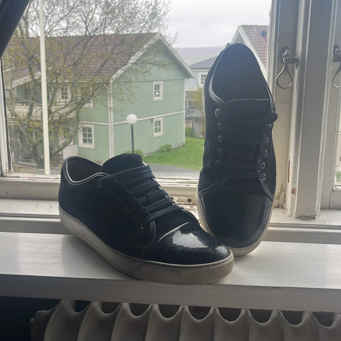 Säljer ett par svarta sneakers från Lanvin med vit platt sula och rund tå. Skorna har snörning och en glansig tådel i svart. Klassisk och stilren design, perfekt för dig som gillar lyxiga detaljer.