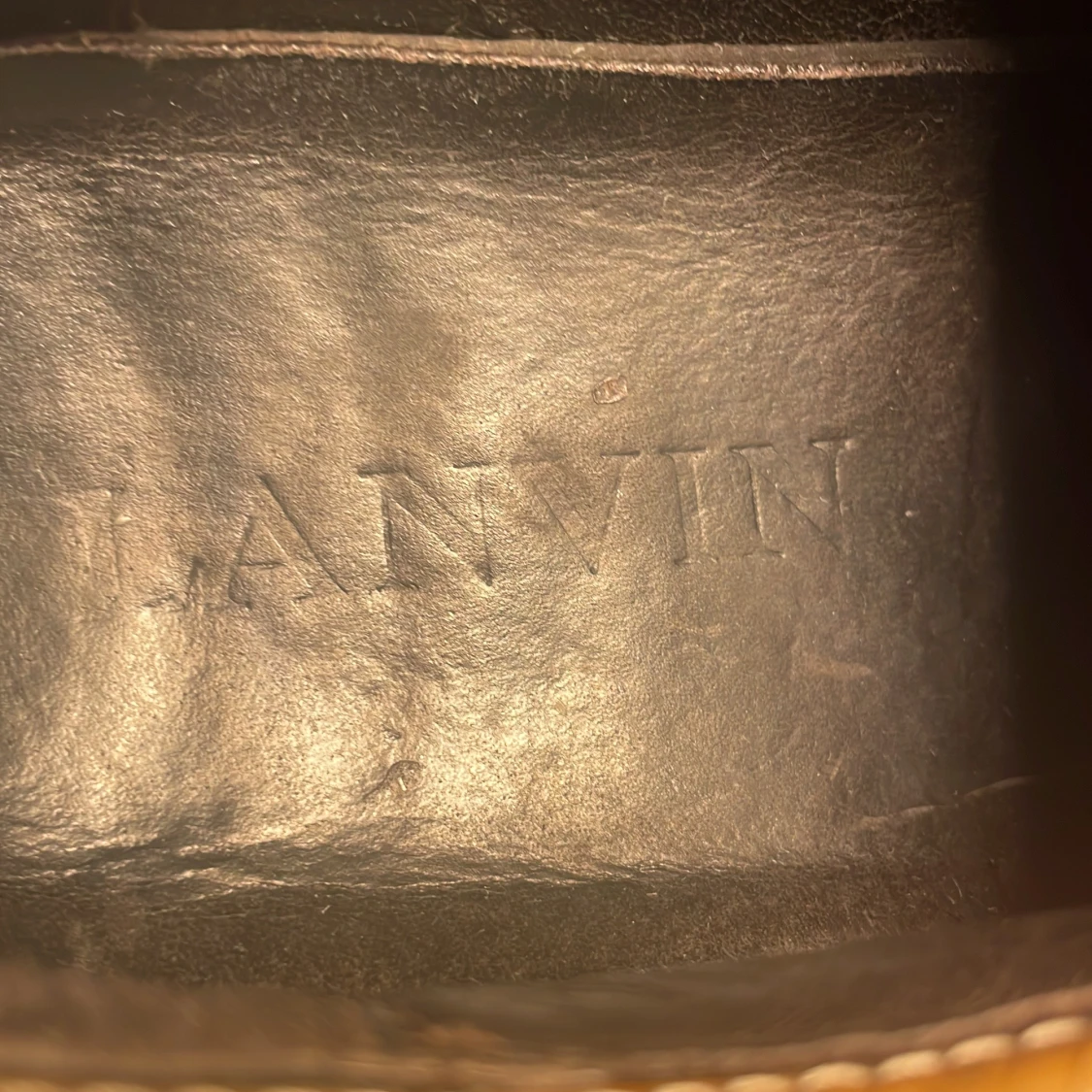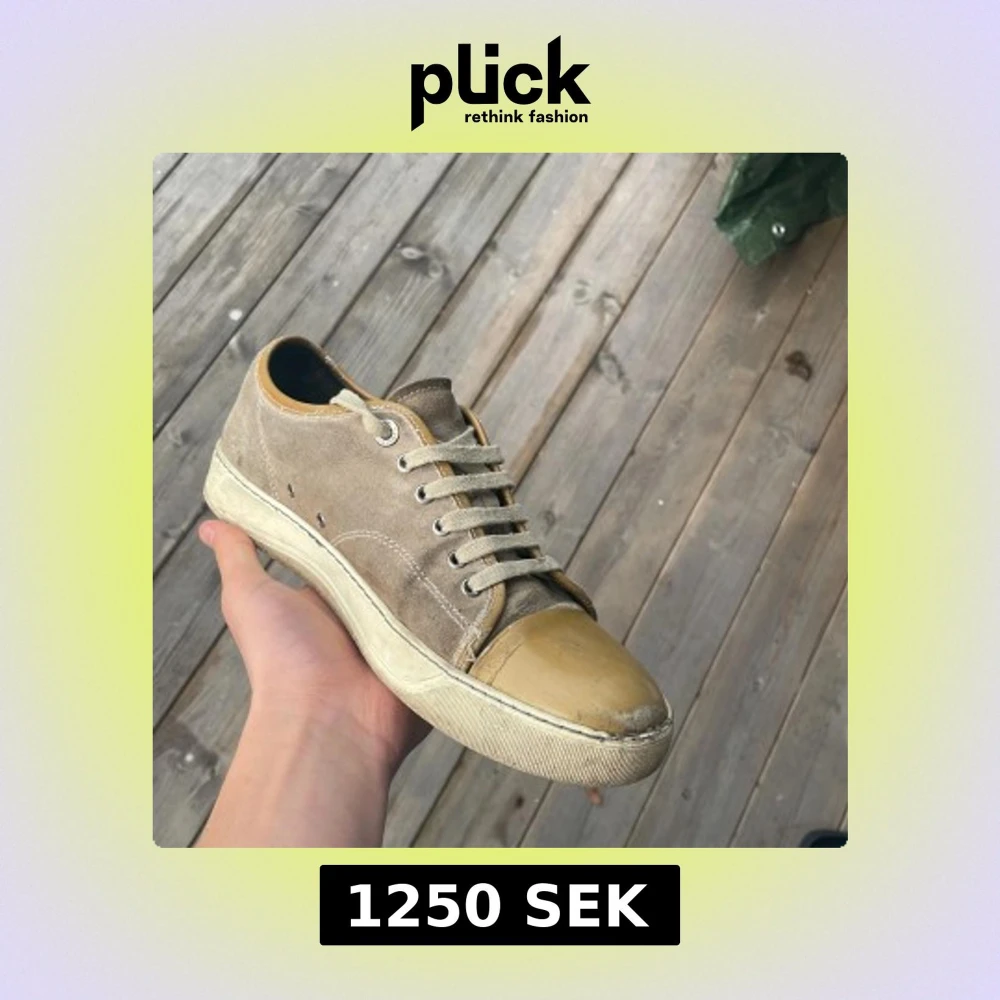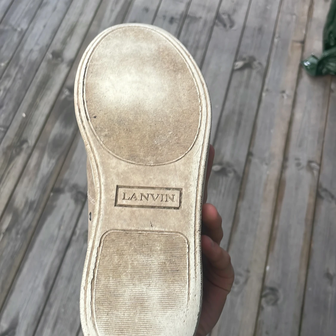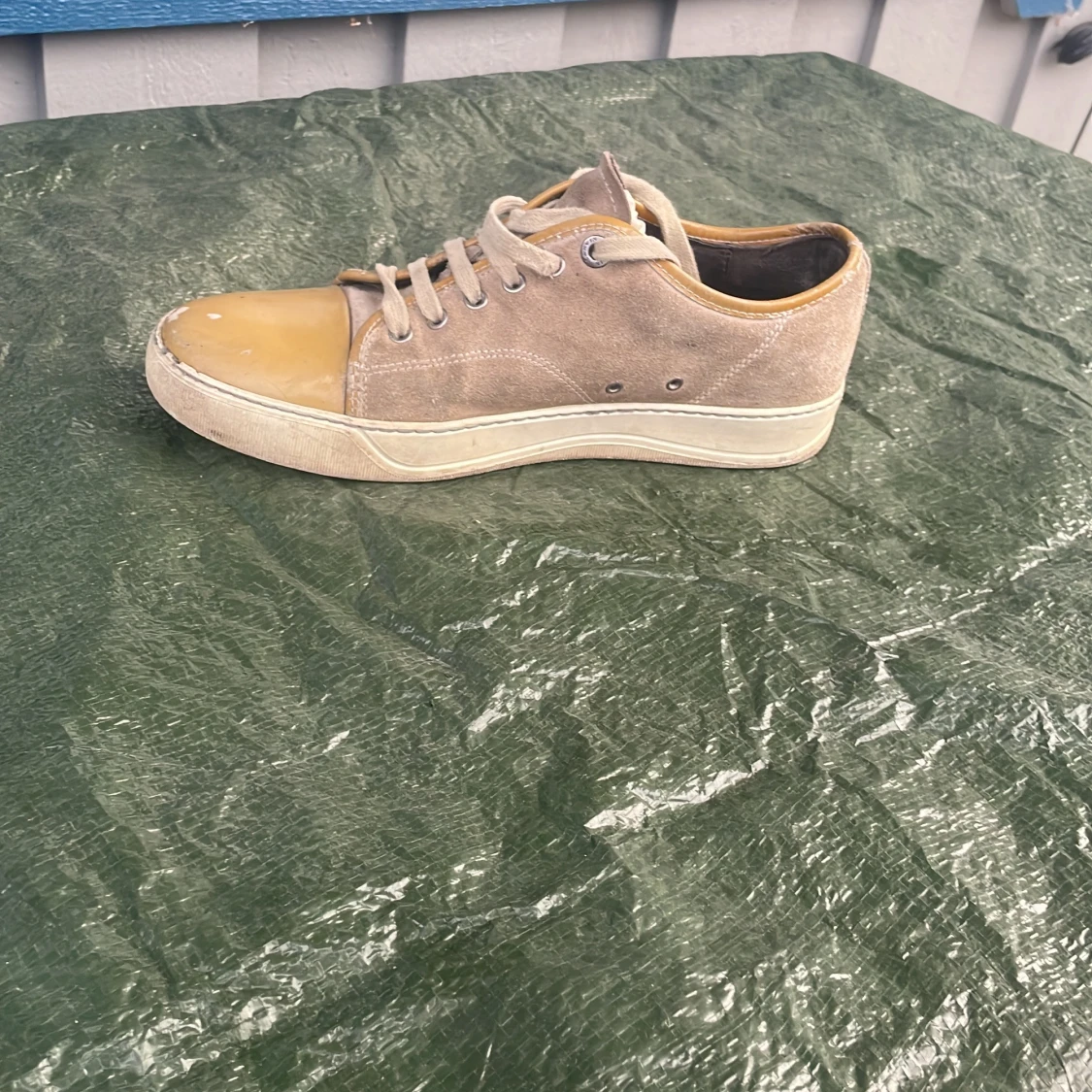 Lanvin sneakers i beige mocka med rund gul gummitå och platt vit sula. Klassisk låg modell med snörning och metallöglor. Snygg kontrast mellan mocka och gummi framtill, perfekt för dig som gillar stilrena och unika detaljer.