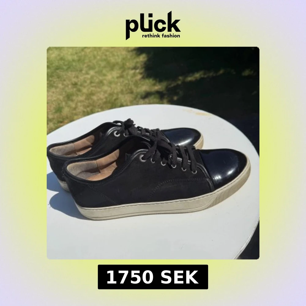 Säljer ett par svarta sneakers från Lanvin med snygg lackad tå och vit sula. Skorna har snörning och en klassisk, stilren design som passar till mycket. Märket syns på innersulan och yttersulan. Perfekta för dig som gillar exklusiva sneakers. Box dusbag och snoskören medföljer