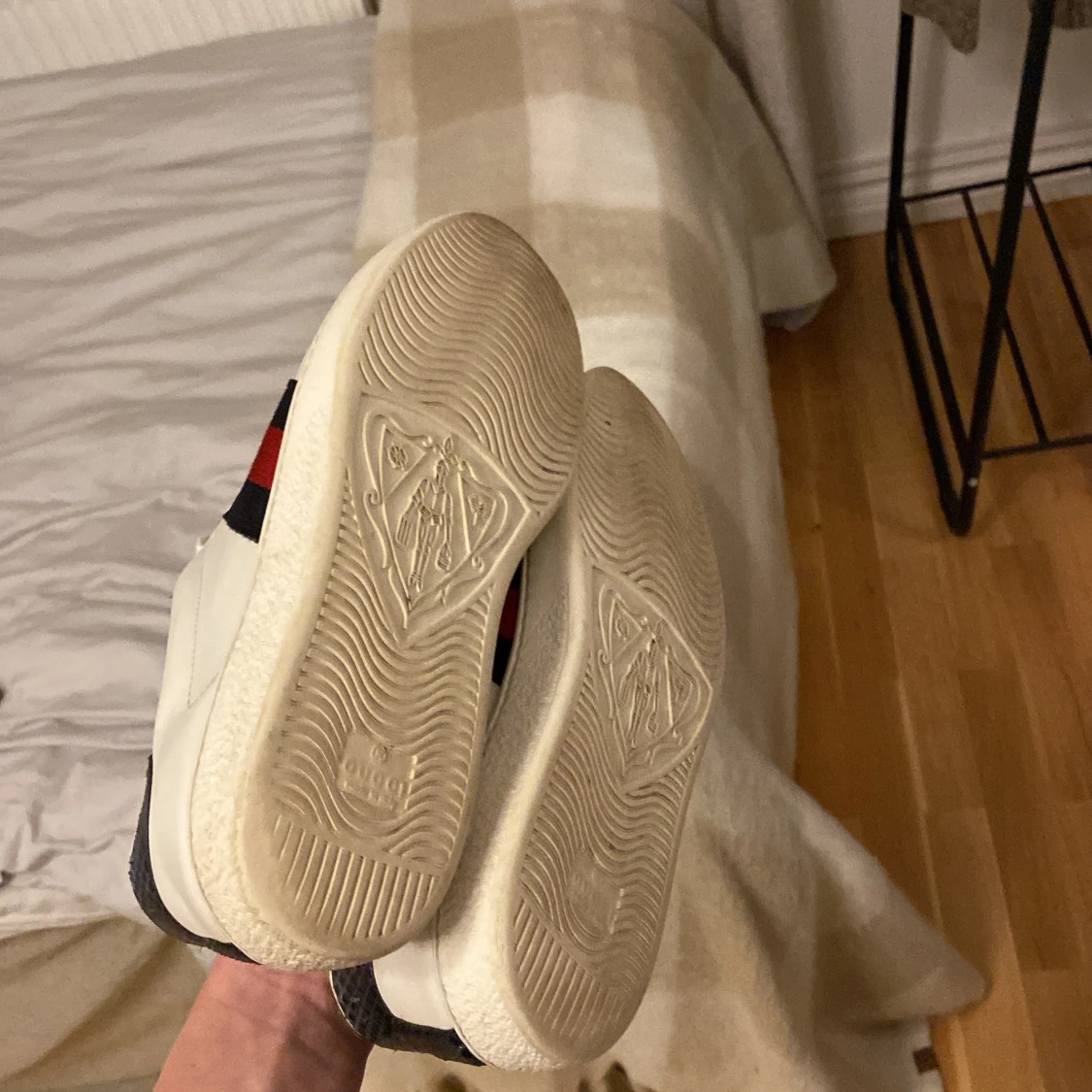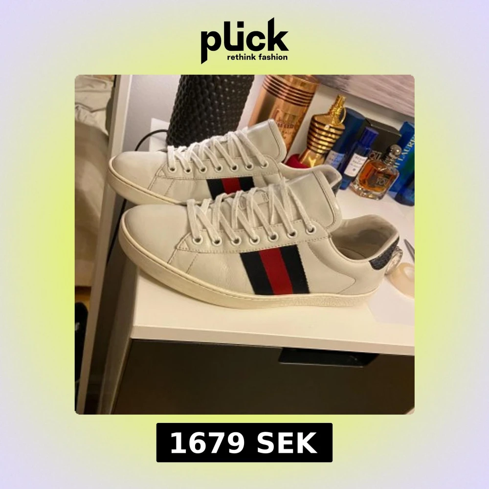 Snygga vita sneakers från Gucci med klassiska ränder i rött och blått på sidan. Skorna har en stilren design med snörning och en diskret logga på hälen. Perfekta för en trendig look. JAG TAR BYTEN