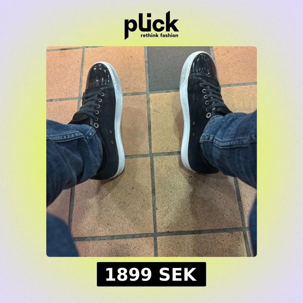 Svarta sneakers med vit sula och snörning. Tåpartiet är i blankt lackmaterial som ger en cool kontrast mot resten av skon som är i mocka. Rund tå och metallfärgade öljetter för snören. Perfekt för dig som gillar stilrena och moderna detaljer.
