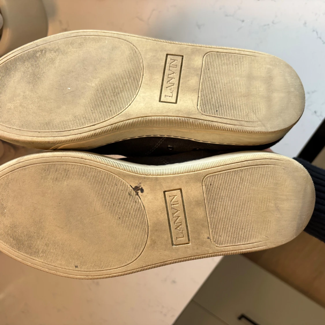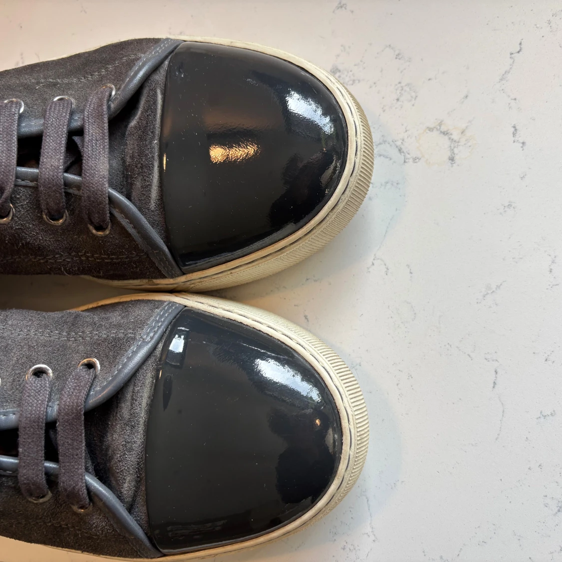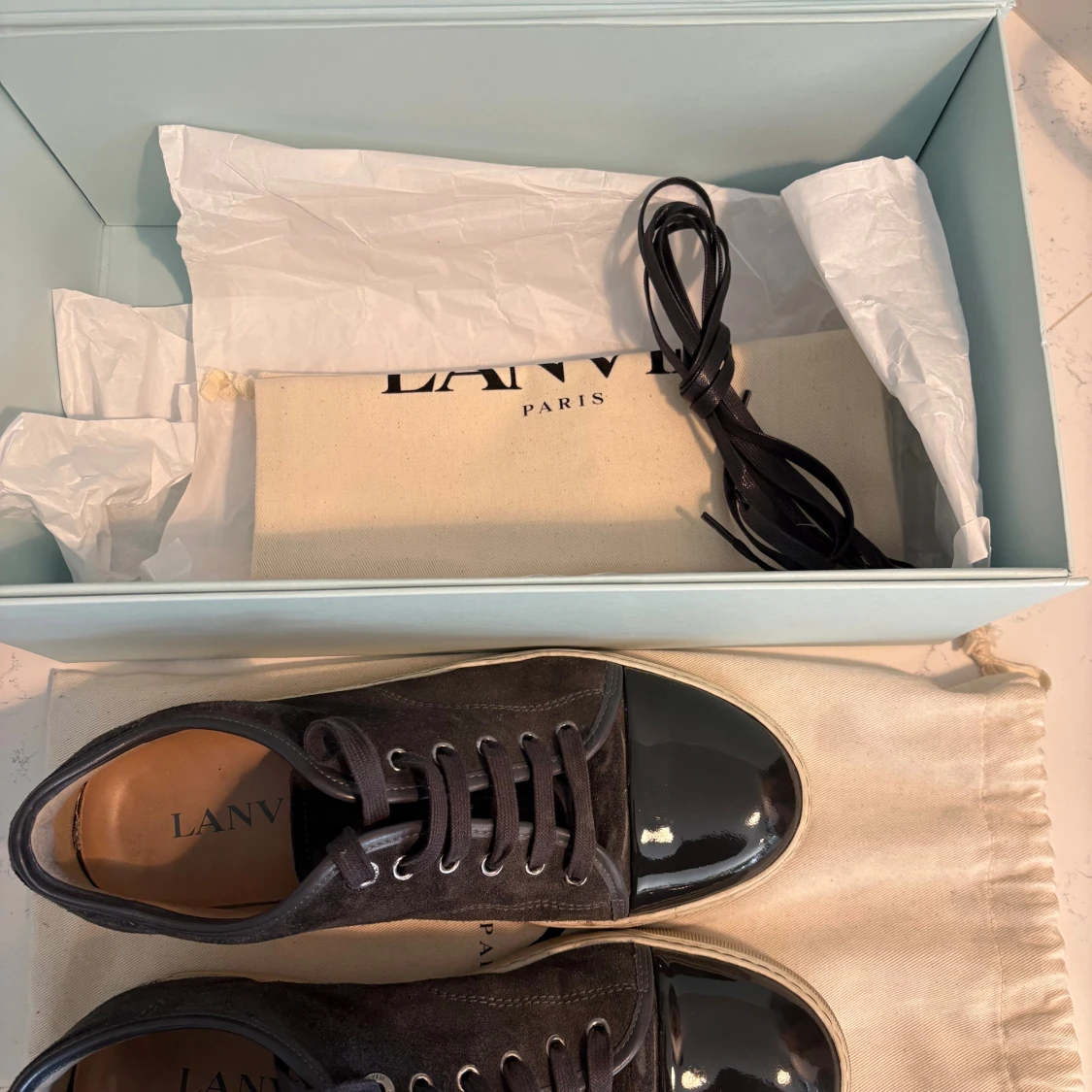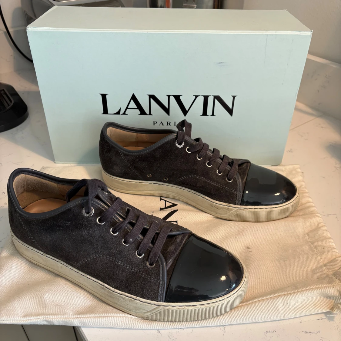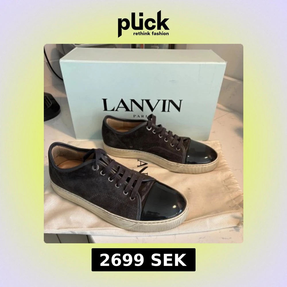 Snygga mörkgråa sneakers från Lanvin med ovandel i lyxig mocka och glansig lackad tå. Skorna har vita gummisulor, klassisk snörning och rund tå. Kommer med originalkartong, 2 dustbag och extra skosnören. Perfekta för dig som gillar stilrena och exklusiva sneakers. Köpte in 2023 och har använt dom väl och alltid lagt tillbaka i dustbag efter använding. Dom är i storlek UK 7 så alltså 41. Hör av er vid fler frågor!