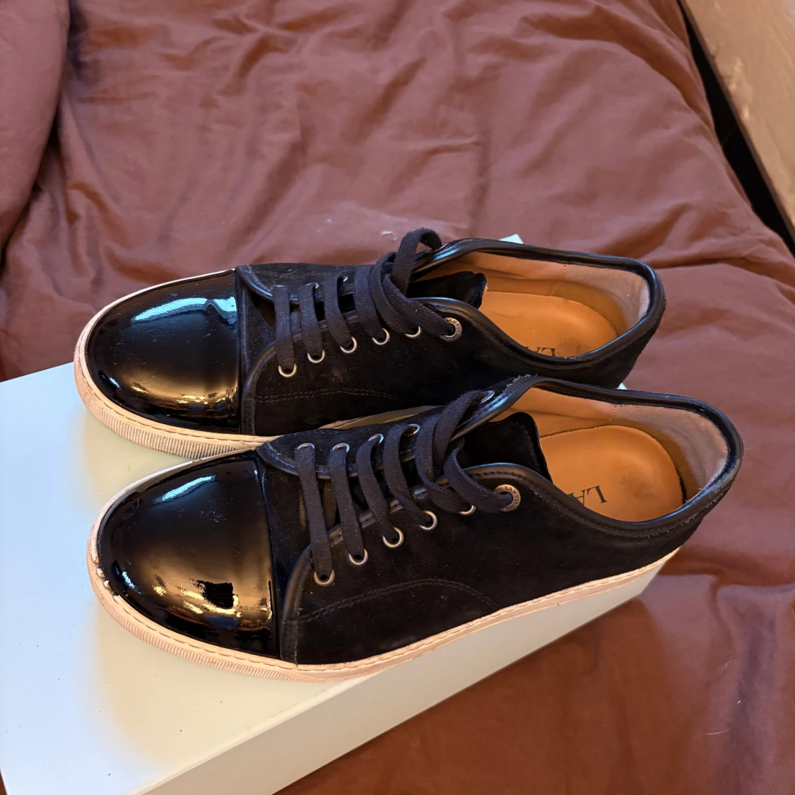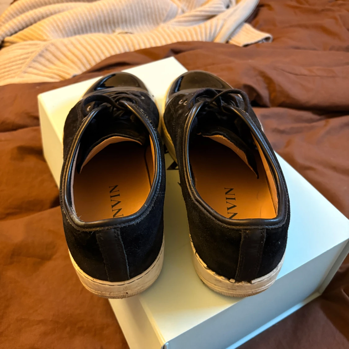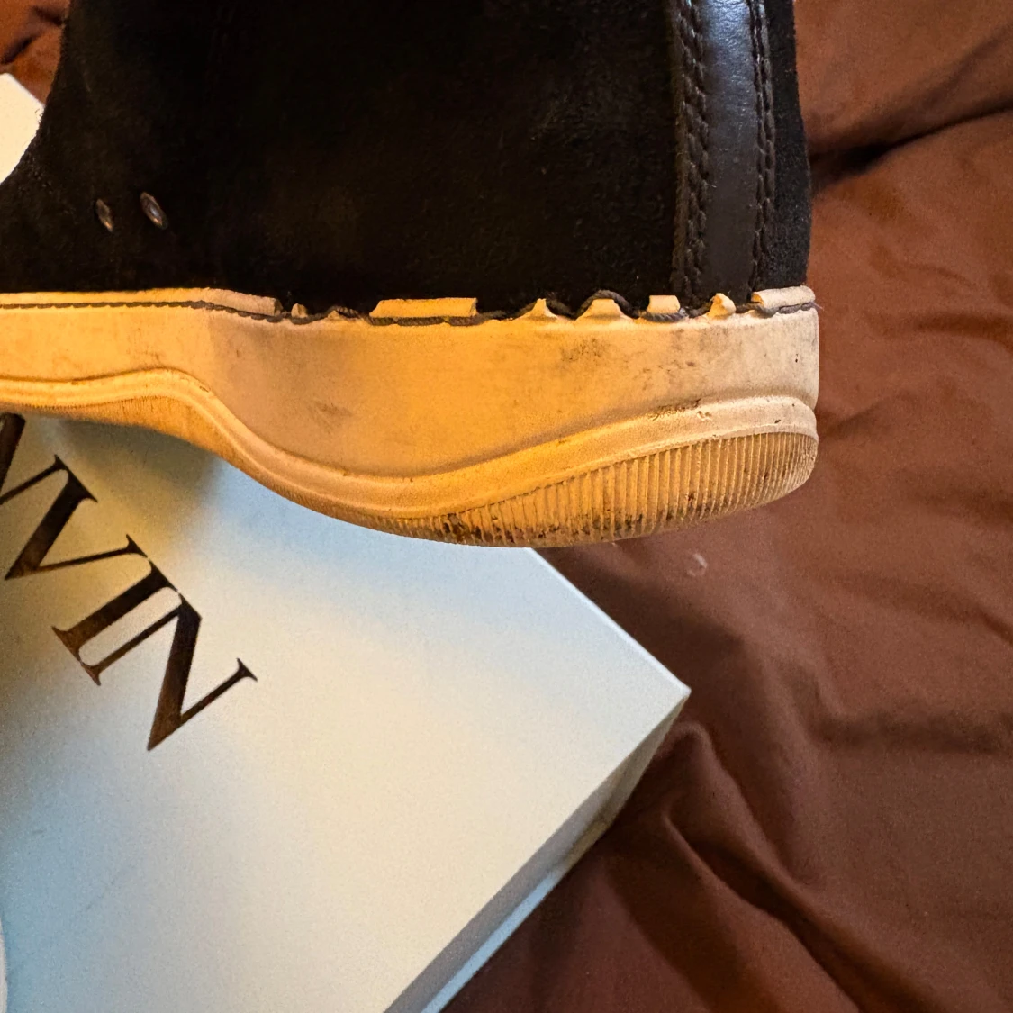 Storlek 43. Skorna är i okej skick, finns skador men inget som påverkar funktionen. Sulorna är relativt vita bara lite smutsiga som lätt går bort vid en tvätt. Kvitto finns!