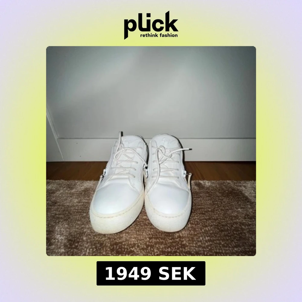 Snygga vita sneakers från Giuseppe Zanotti med snörning och dragkedja på sidan. Tillverkade i skinn för en lyxig känsla. Perfekta för en stilren look. Skorna kostar 6500kr nypris och jag säljer för 1949kr då de är riktigt bra skick😊😊