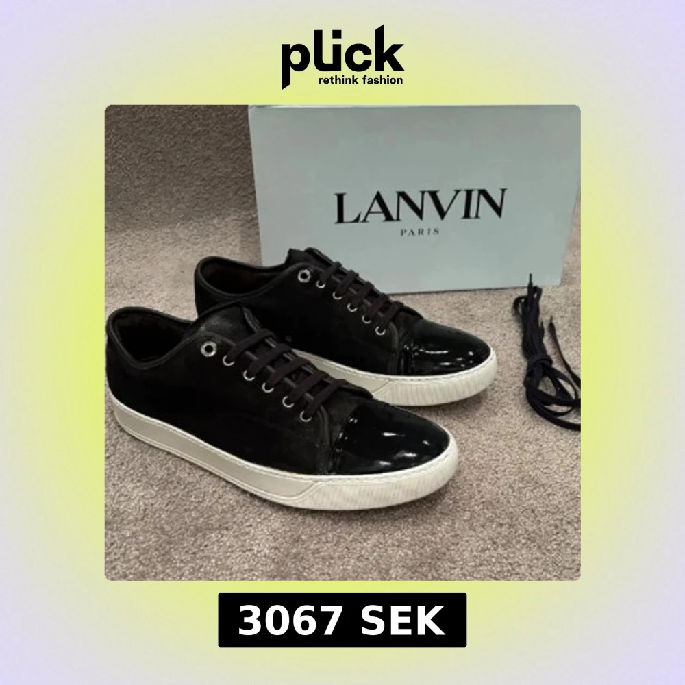 Snygga svarta sneakers från Lanvin med vit sula och glansig lackad tå. Skorna har snörning, metallöljetter och en mix av mocka och skinn. Perfekta för dig som gillar stilrena men ändå unika detaljer. Extra skosnören medföljer.