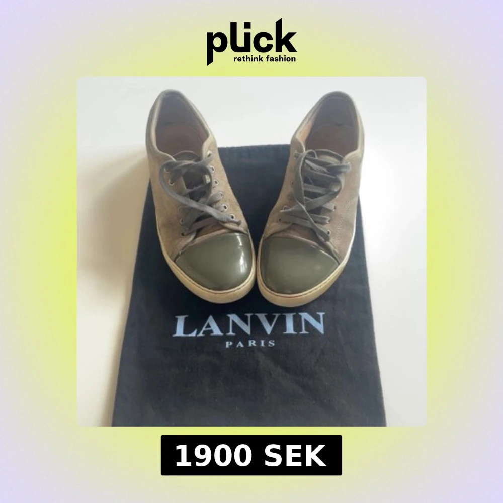 Säljer ett par snygga sneakers från Lanvin i beige mocka med grön/grått blankt material. Storlek UK 6 ( 41-42) Skorna har snörning och en vit sula. Obs: snörena är lite trasiga på två av snörena. ( medföljer bara påse till skorna ) skriv vid intresse!⭐️( priset är inte hugget i sten )