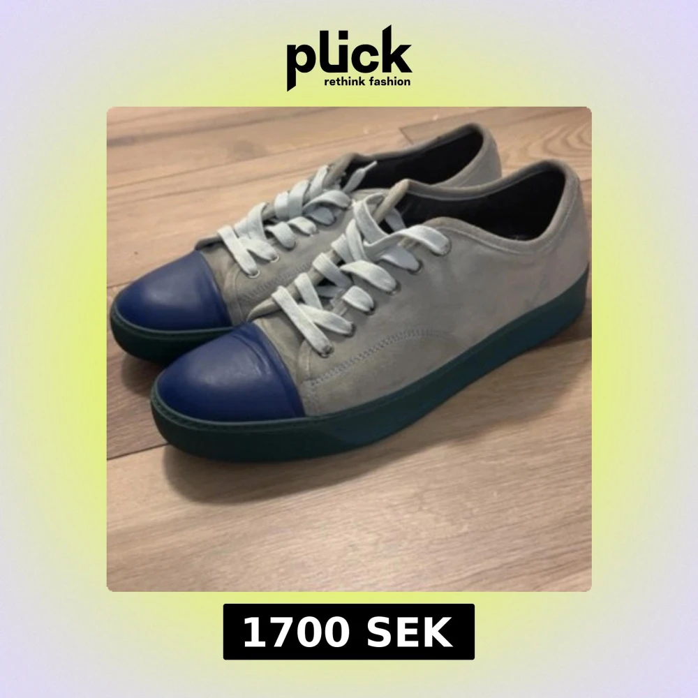 Snygga sneakers från Lanvin i ljusgrå mocka med blått skinn över tån och gröntonad sula. Skorna har vita snören och en klassisk låg profil. Perfekta för dig som gillar stilrena men ändå unika detaljer.