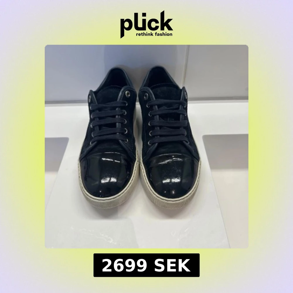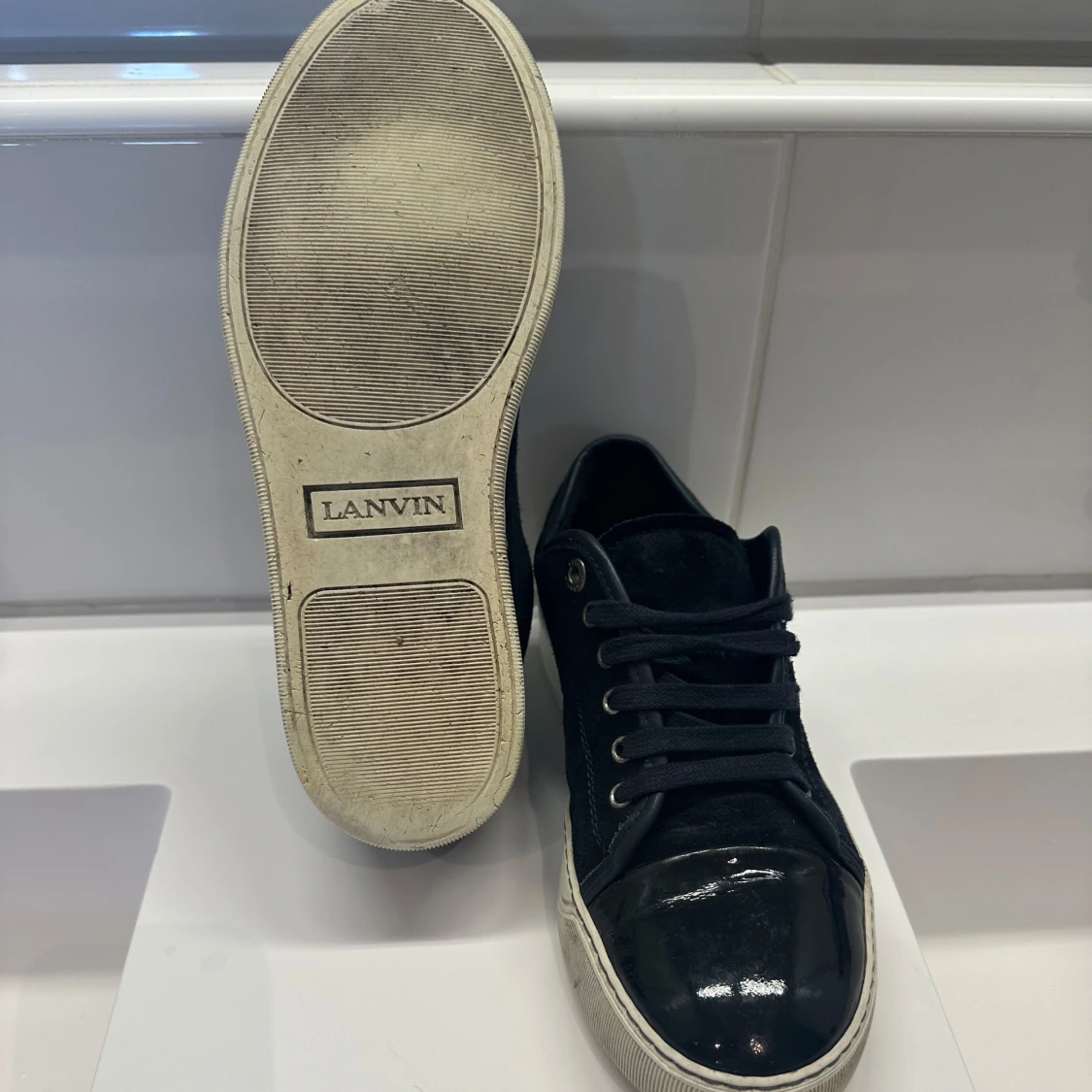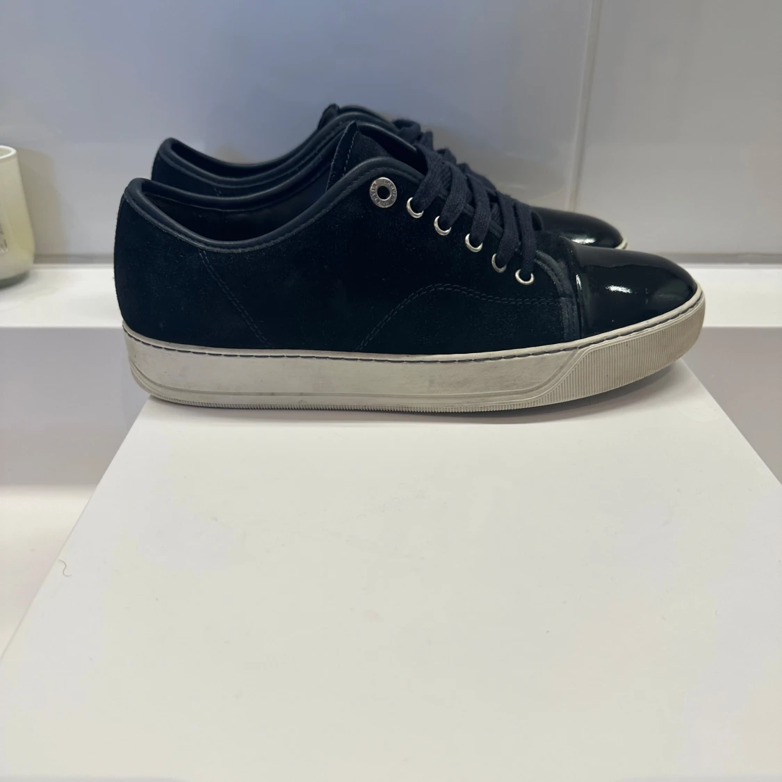 Snygga svarta sneakers från Lanvin med ovandel i mocka och lackad tå. Skorna har vita sulor, svarta skosnören och metallfärgade öljetter. Perfekta för dig som gillar stilrena och exklusiva sneakers med en twist. Storlek UK6. Box fås med!!