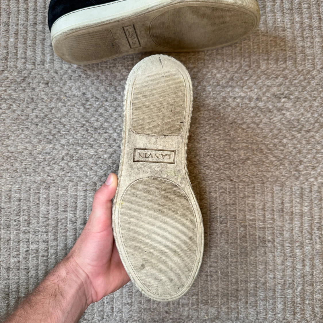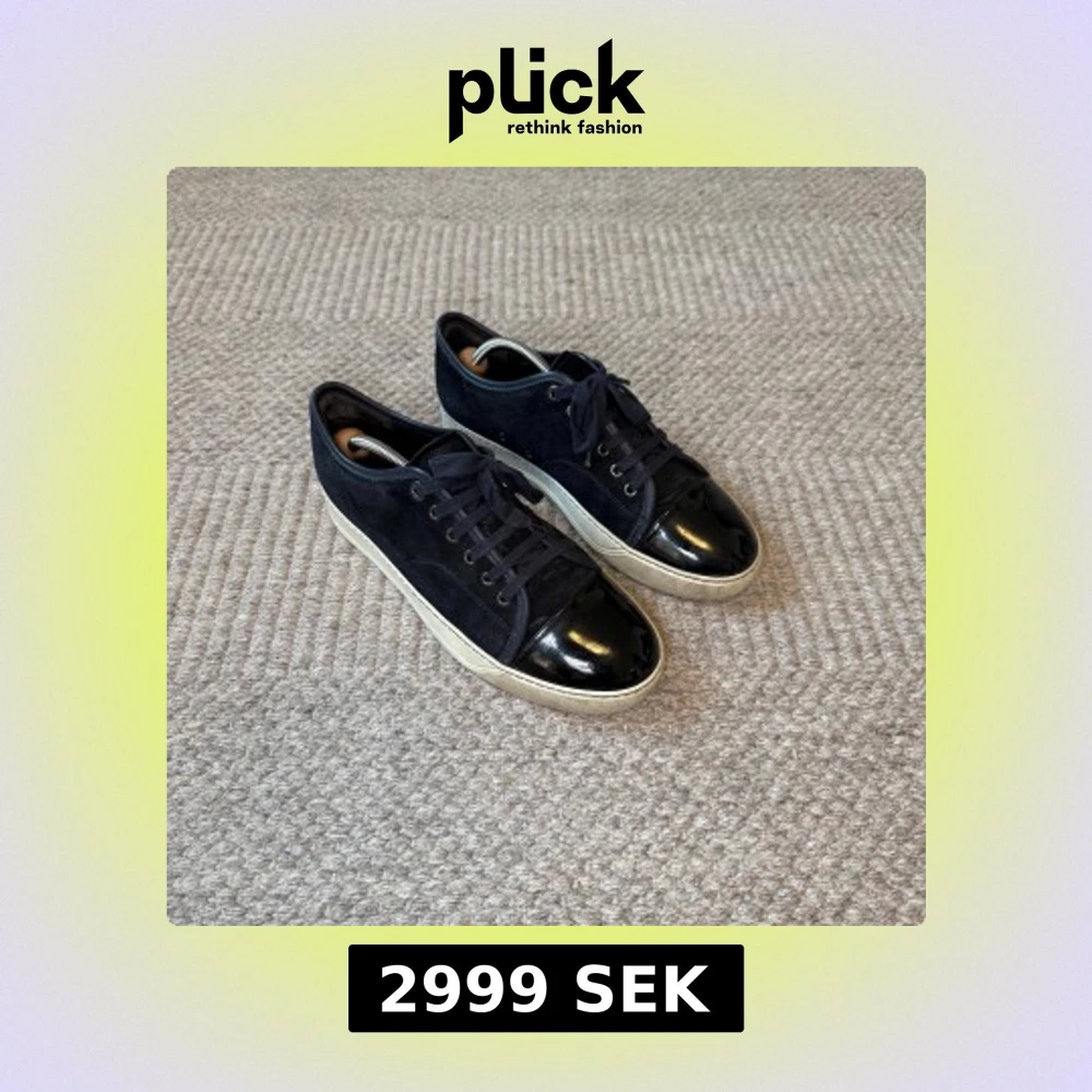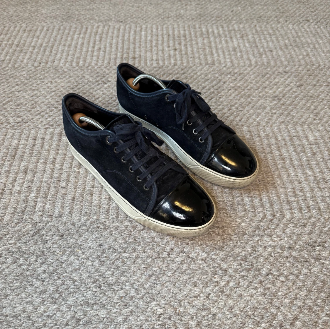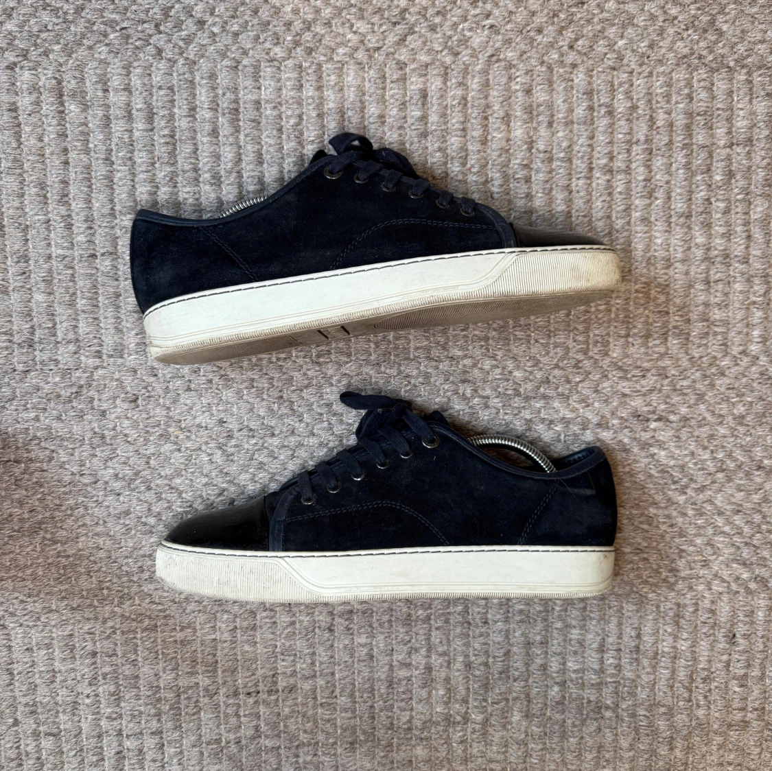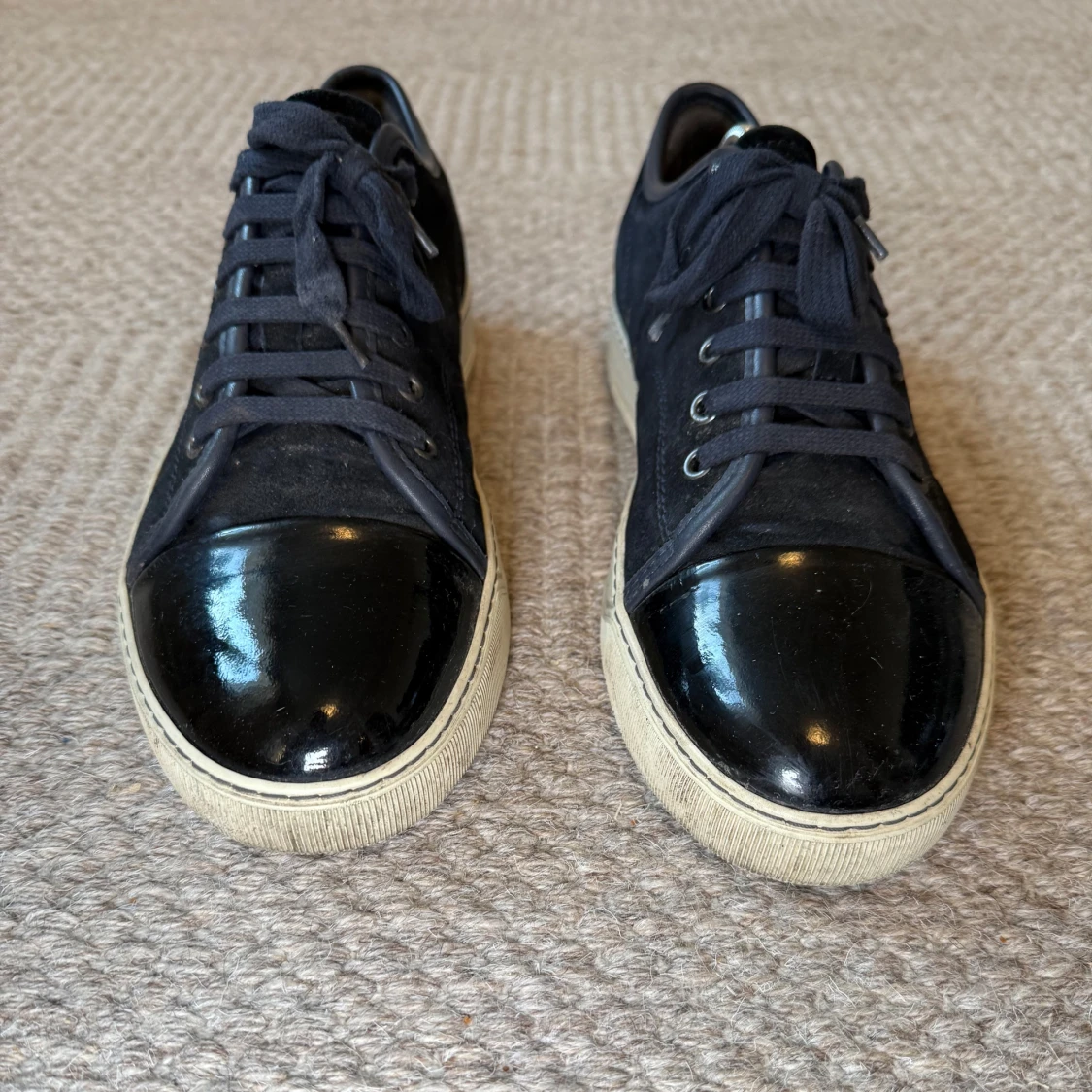 Snygga svarta sneakers från Lanvin med en cool lackad tå och ovandel i mocka. Skorna har snörning och en vit platt sula som ger en schysst kontrast. Perfekta för dig som gillar stilrena detaljer och vill sticka ut lite extra.