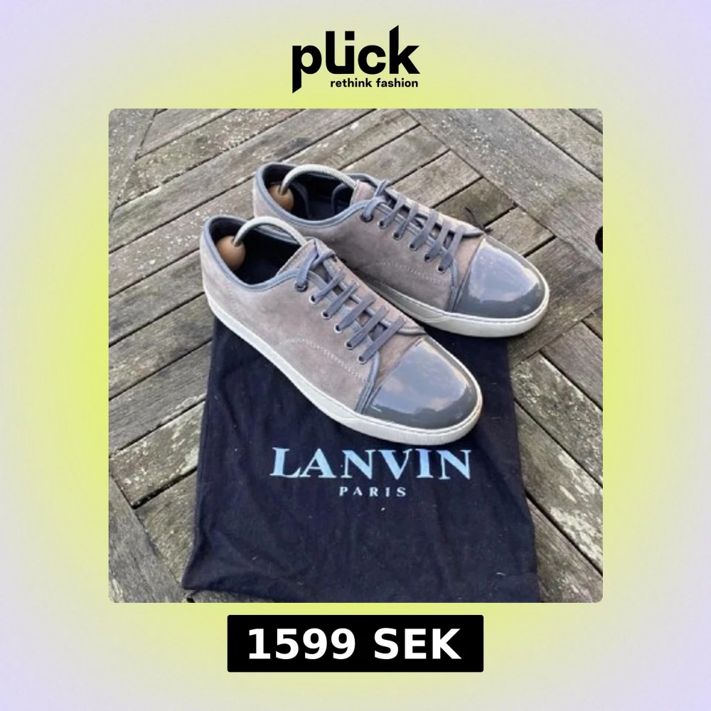 Säljer ett par grå sneakers från Lanvin med snygg lackad tå i mörkgrått och ovandel i mocka. Skorna har snörning och vit platt sula. Perfekta för dig som gillar stilrena och exklusiva sneakers. Skorna har även ett litet hål i sulan, men inget som syns.